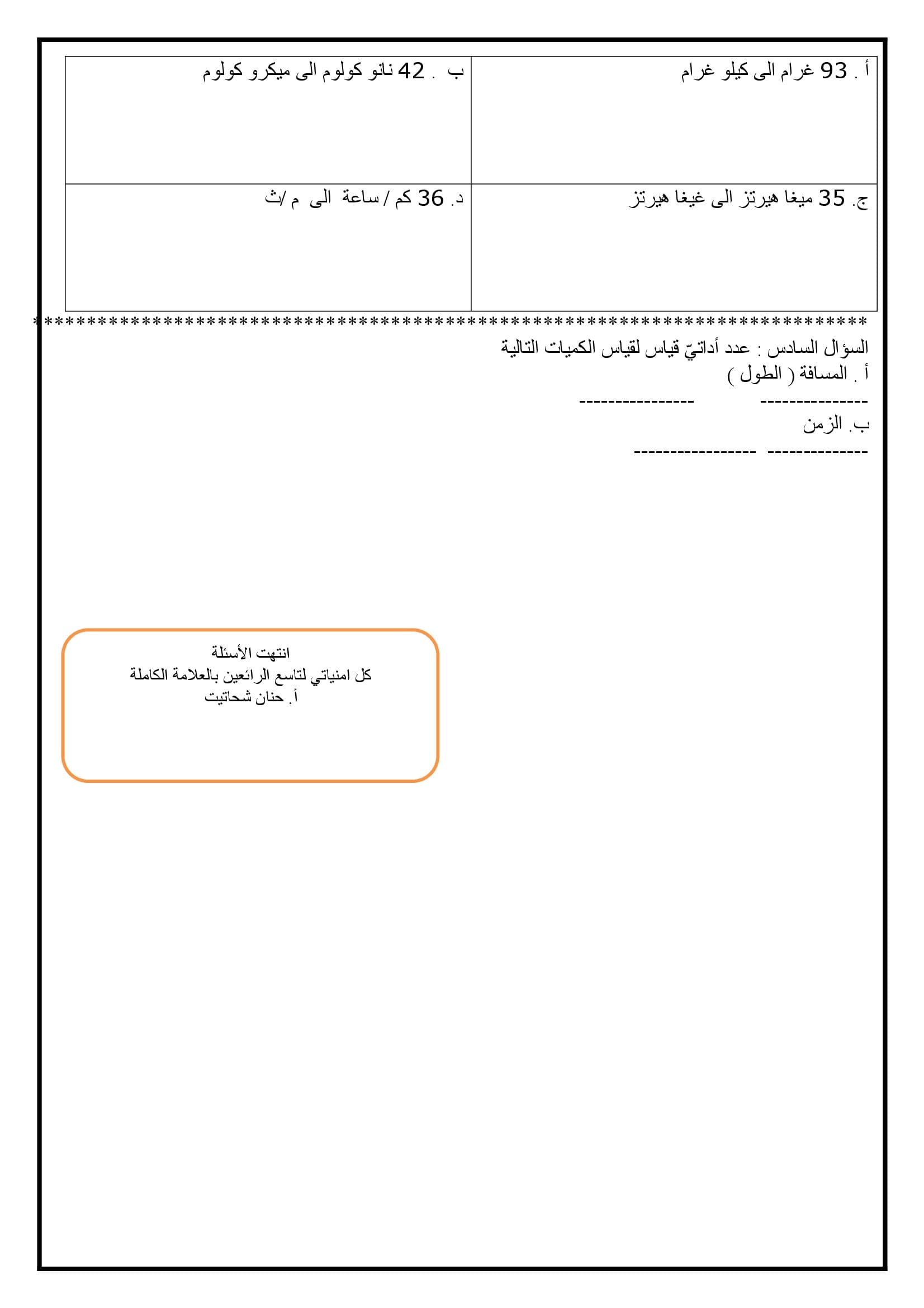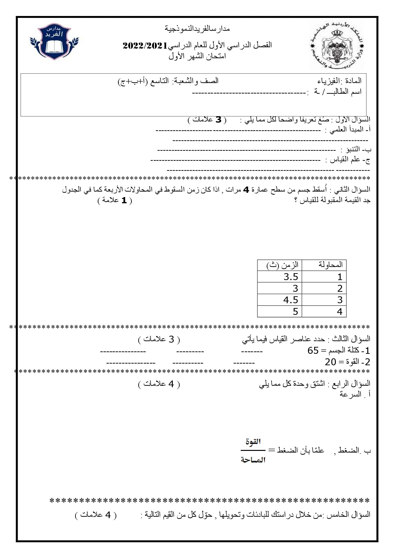 صور و ملف وورد امتحان الشهر الاول لمادة الفيزياء للصف التاسع الفصل الاول 2021