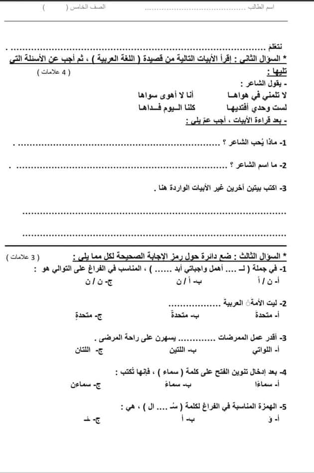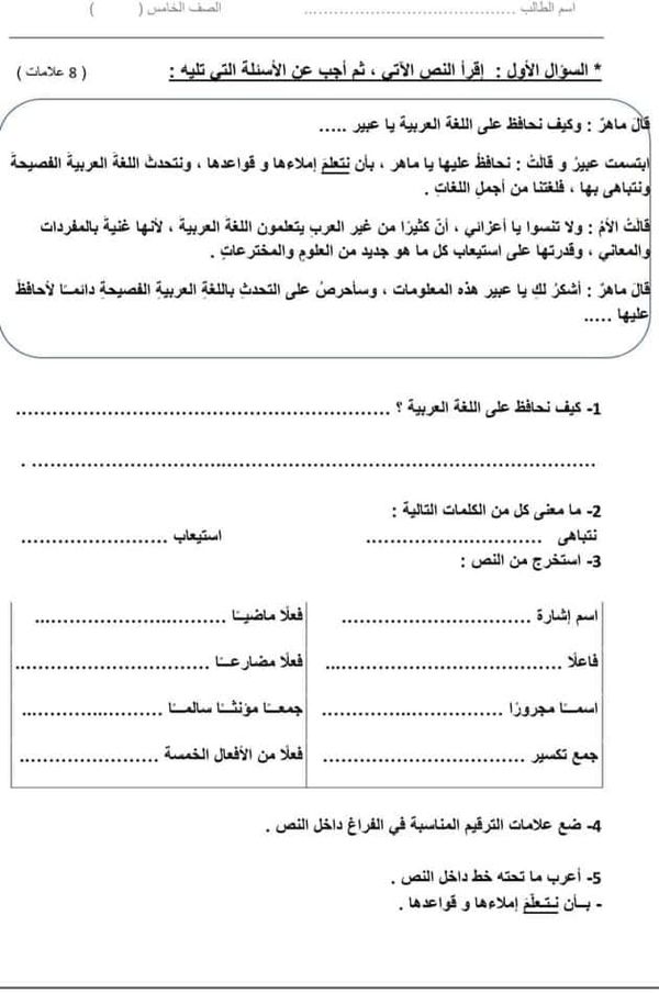 بالصور امتحان الشهر الاول لغة عربية للصف الخامس الفصل الاول 2021 بالصور اختبار الشهر الاول لغة عربية للصف الخامس الفصل الاول 2021 بالصور اختبار الشهر