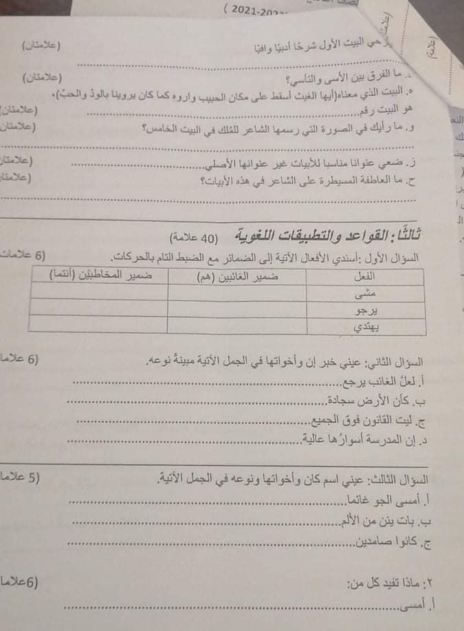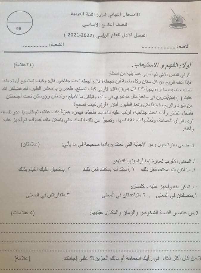 صور امتحان نهائي لمادة اللغة العربية للصف التاسع الفصل الاول 2021 صور اختبار نهائي لمادة اللغة العربية للصف التاسع الفصل الاول 2021 صور امتحان نهائي ل