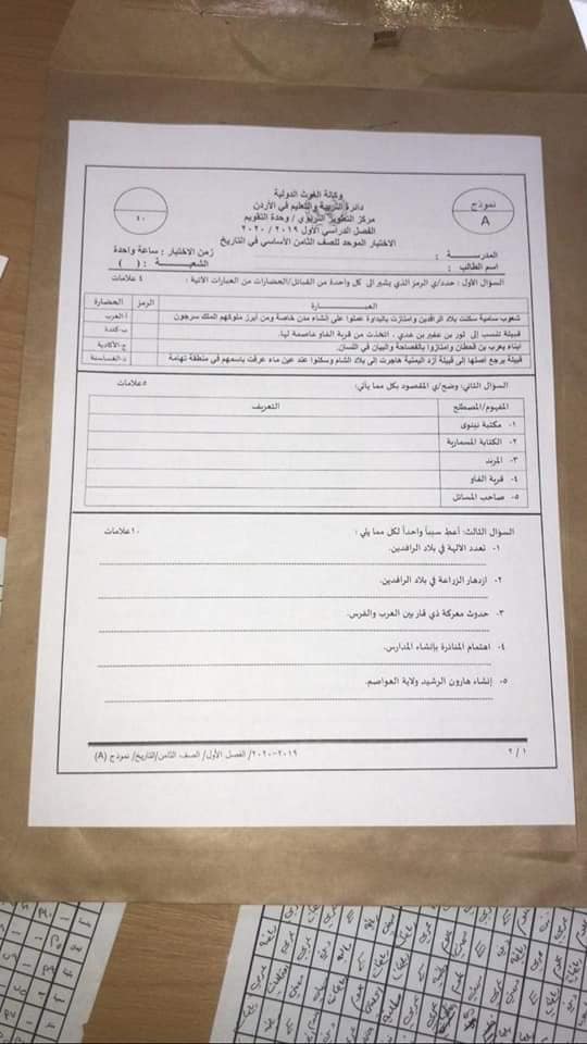 صور امتحان نهائي لمادة التاريخ للصف الثامن الفصل الاول 2019 نموذج A وكالة صور اختبارنهائي لمادة التاريخ للصف الثامن الفصل الاول 2019 نموذج A وكالة صور