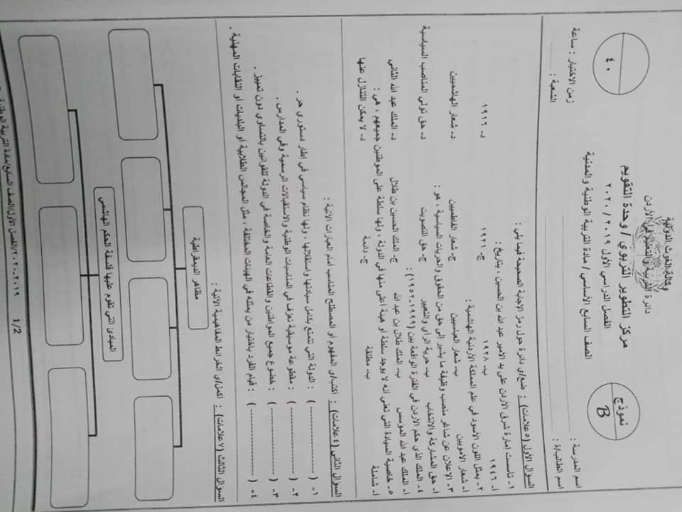 صور اختبار نهائي لمادة التربية الوطنية للصف السابع الفصل الاول 2019 نموذج B وكالة