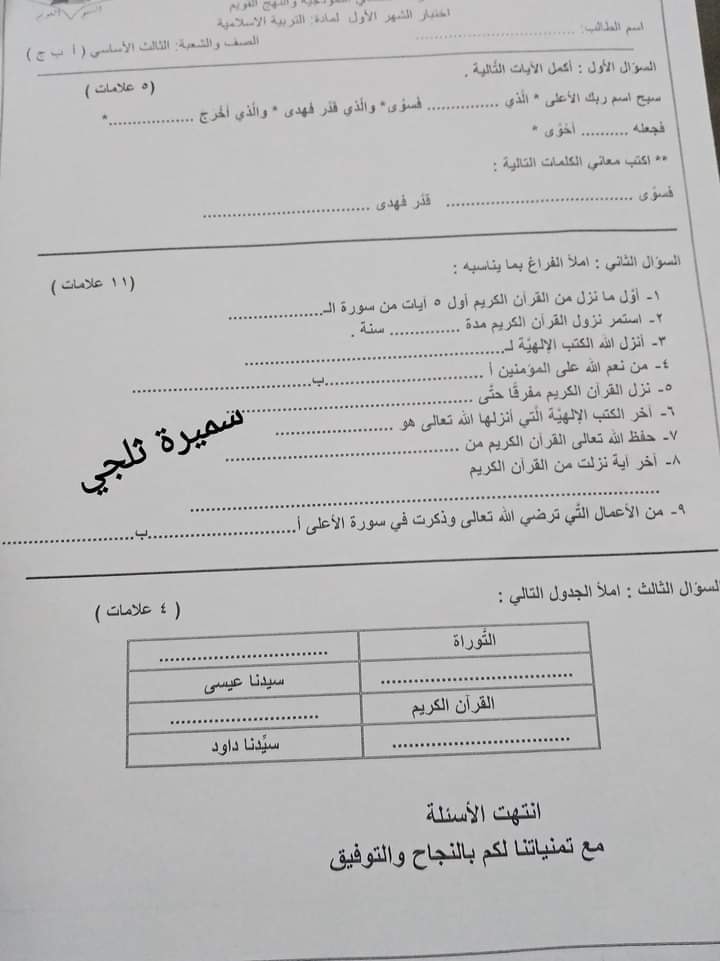صور اختبار الشهر الاول لمادة التربية الاسلامية للصف الثالث الفصل الاول 2019 صور امتحان الشهر الاول لمادة التربية الاسلامية للصف الثالث الفصل الاول 201