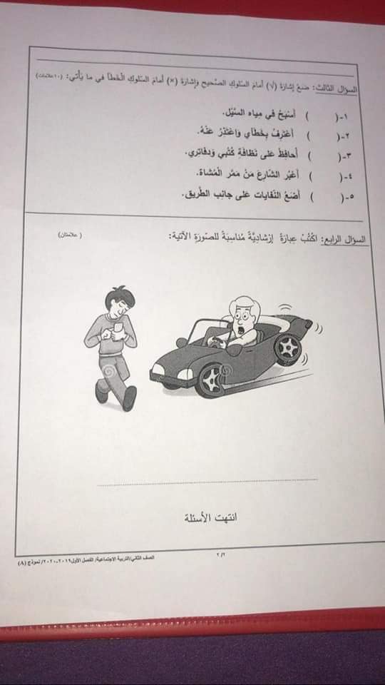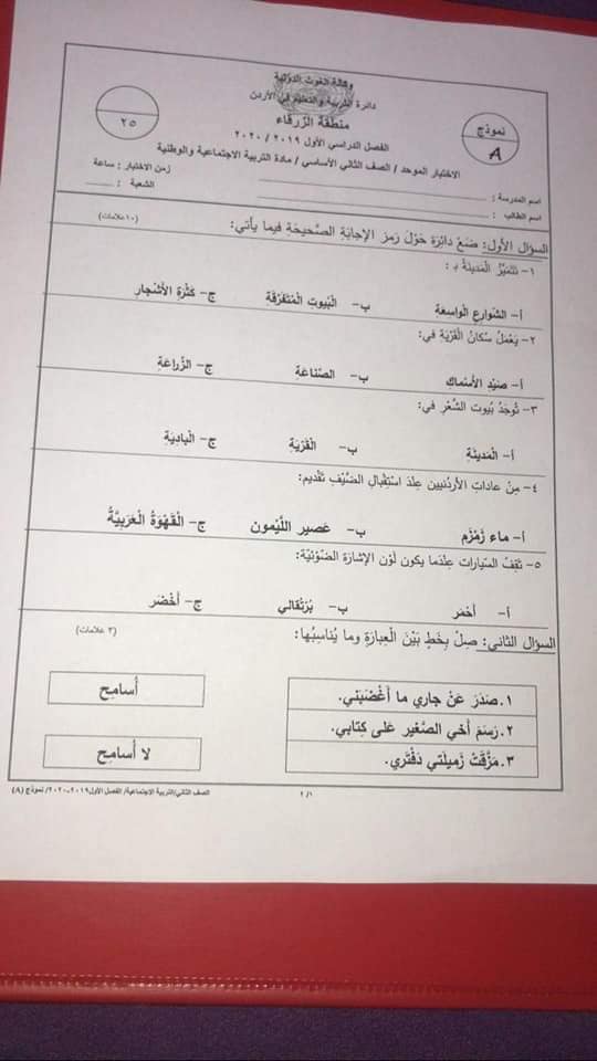صور امتحان نهائي لمادة التربية الاجتماعية الاجتماعيات للصف الثاني الفصل الاول 2019 نموذج A وكالة