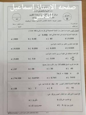 صور امتحان نهائي رياضيات صف خامس فصل ثاني 2025 نموذج (B) وكالة