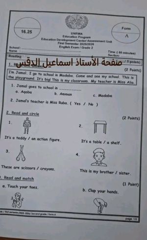 بالصور امتحان نهائي لمادة اللغة الانجليزية للصف الثاني الفصل الاول 2026 وكالة