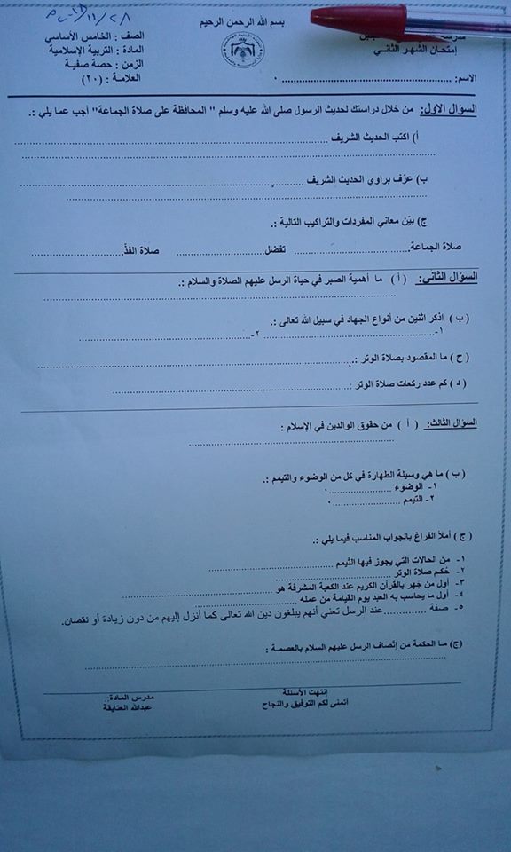 امتحان الشهر الثاني مادة التربية الاسلامية للصف الخامس الفصل الاول 2018 اختبار الشهر الثاني مادة التربية الاسلامية للصف الخامس الفصل الاول 2018 امتح
