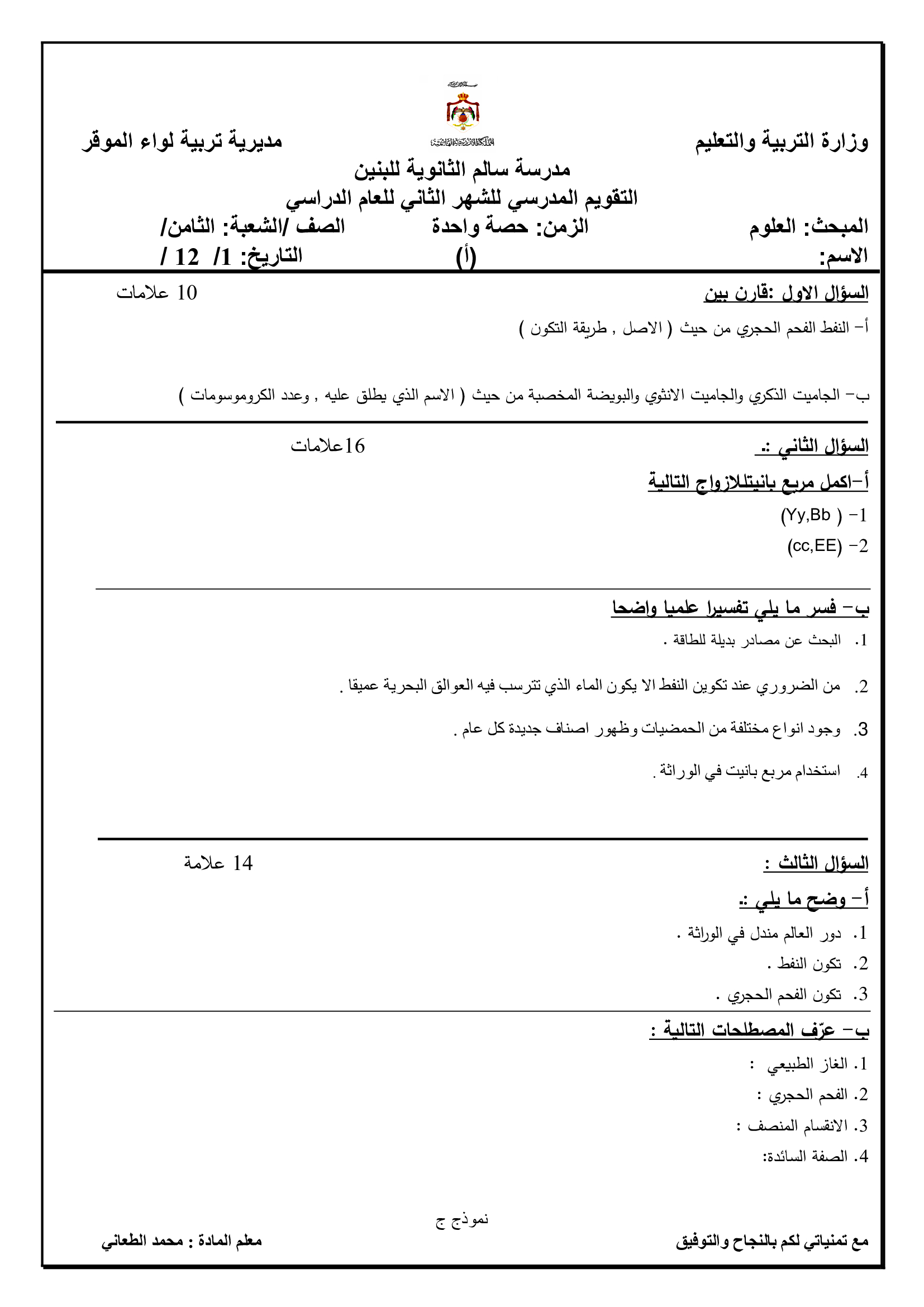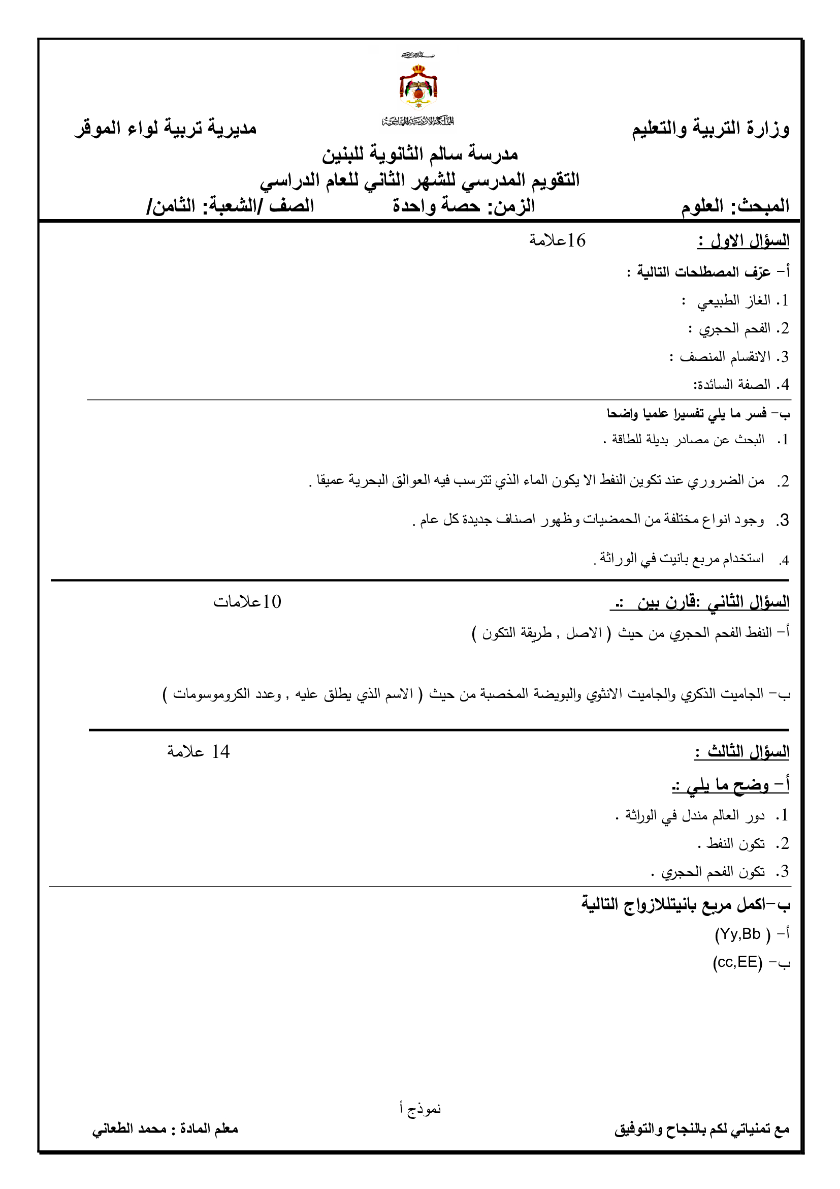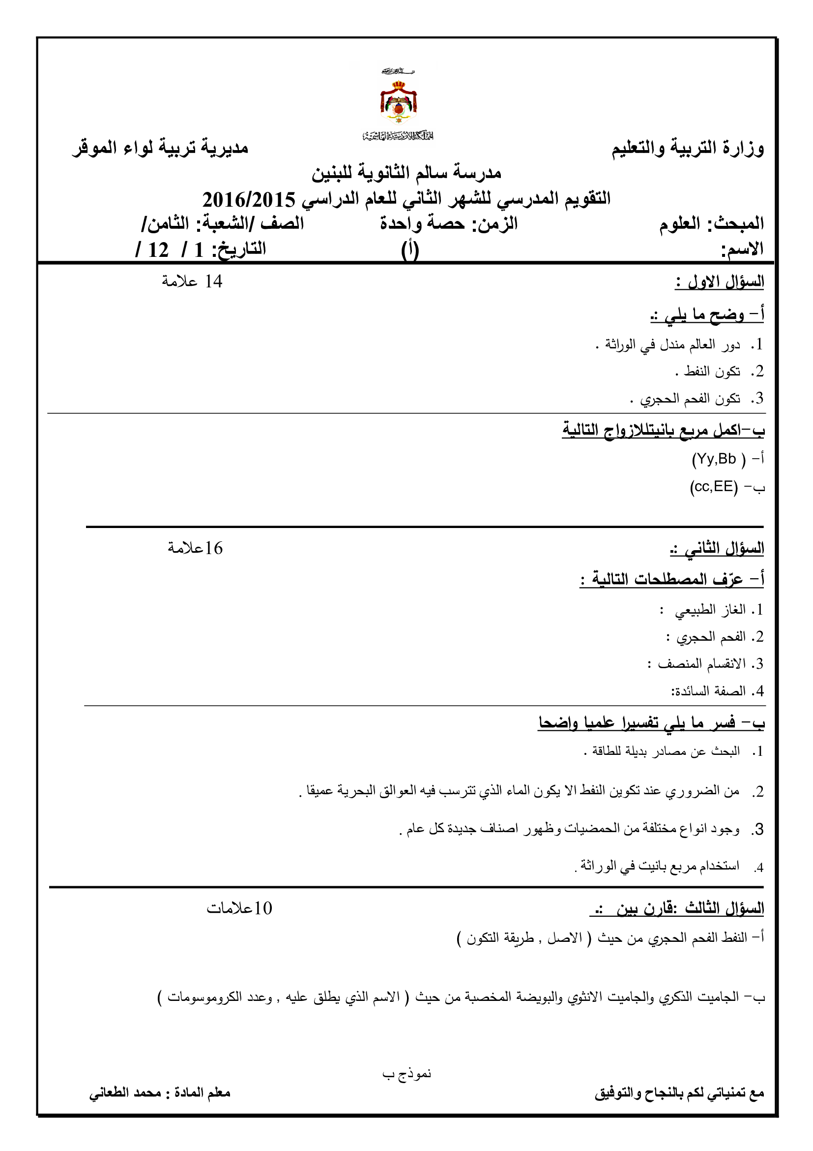اختبار الشهر الثاني لمادة العلوم كاملة للصف الثامن الفصل الاول 2017 امتحان الشهر الثاني لمادة العلوم كاملة للصف الثامن الفصل الاول 2017 امتحان الشهر ا