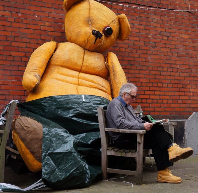 Graham Bolton: "A chance photo taken while having lunch behind St Paul's, also known as the Actors' Church, in Covent Garden, a couple of years ago. The man was busy with his paper and the bear was obviously interested in what he was doing."