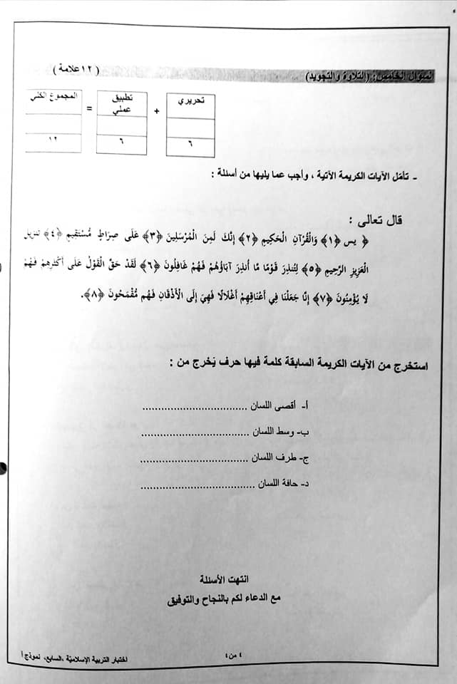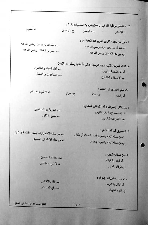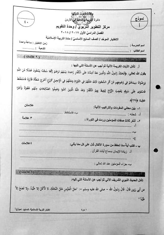 نموذج وكاله اختبار نهائي مصور لمادة التربية الاسلامية للصف السابع الفصل الاول 2017 نموذج وكاله اختبار نهائي مصور لمادة التربية الاسلامية للصف السابع ا