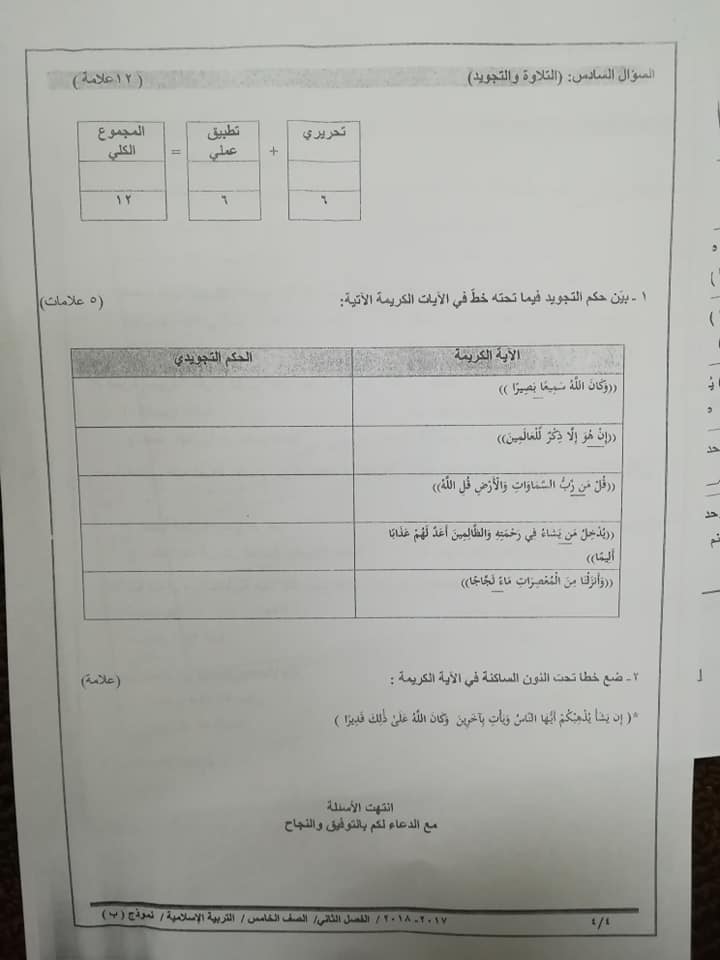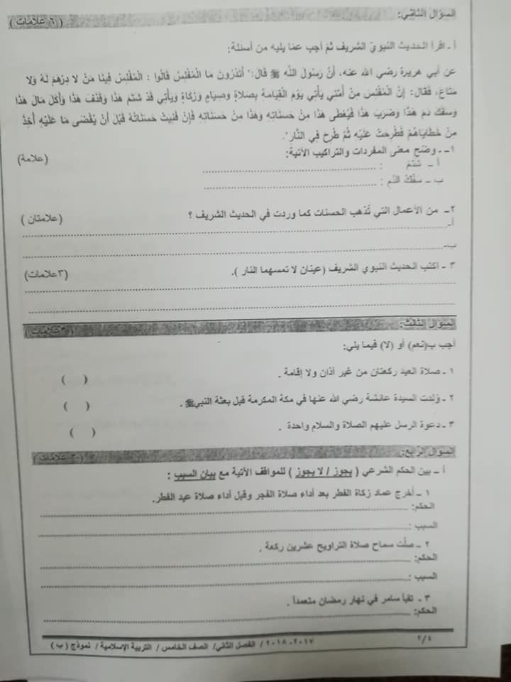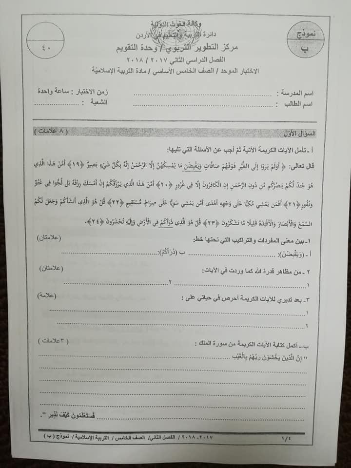 بالصور اختبار وكالة نموذج B مادة التربية الاسلامية للصف الخامس الفصل الثاني 2018 بالصور اختبار وكالة نموذج B مادة التربية الاسلامية للصف الخامس الفصل