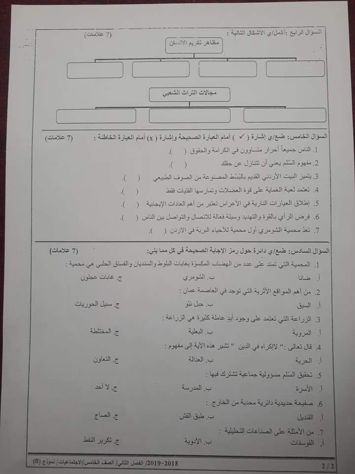 الاختبار النهائي لمادة الاجتماعيات نموذج B وكالة للصف الخامس الفصل الثاني 2019