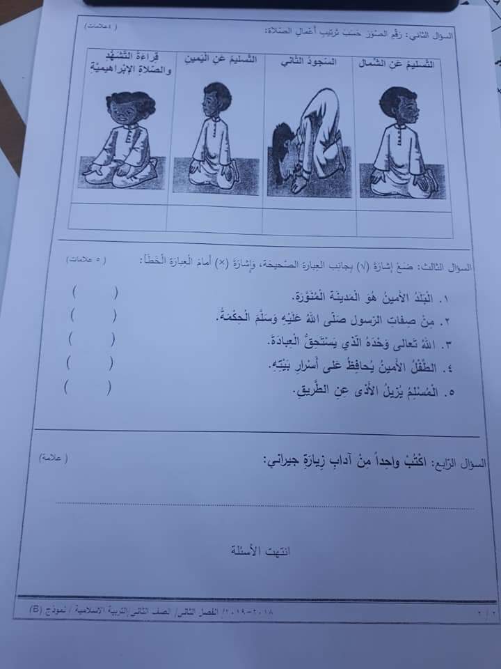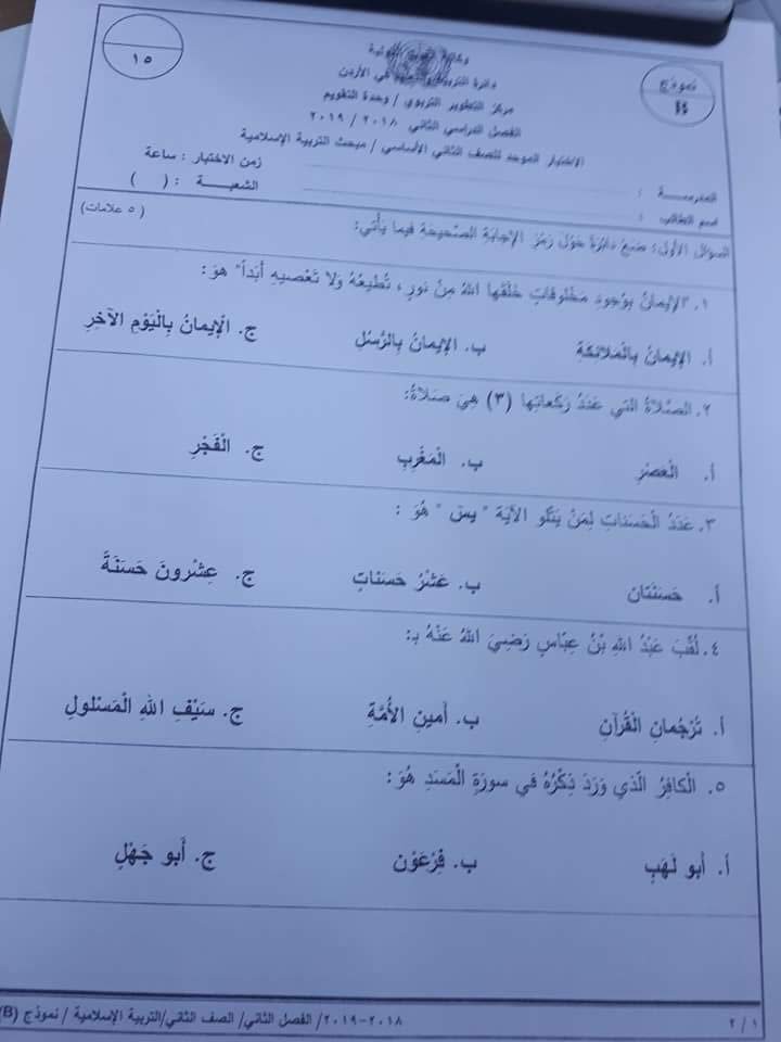 الامتحان النهائي لمادة التربية الاسلامية نموذج B وكالة للصف الثاني الفصل الثاني 2019 الاختبار النهائي لمادة التربية الاسلامية نموذج B وكالة للصف الثان