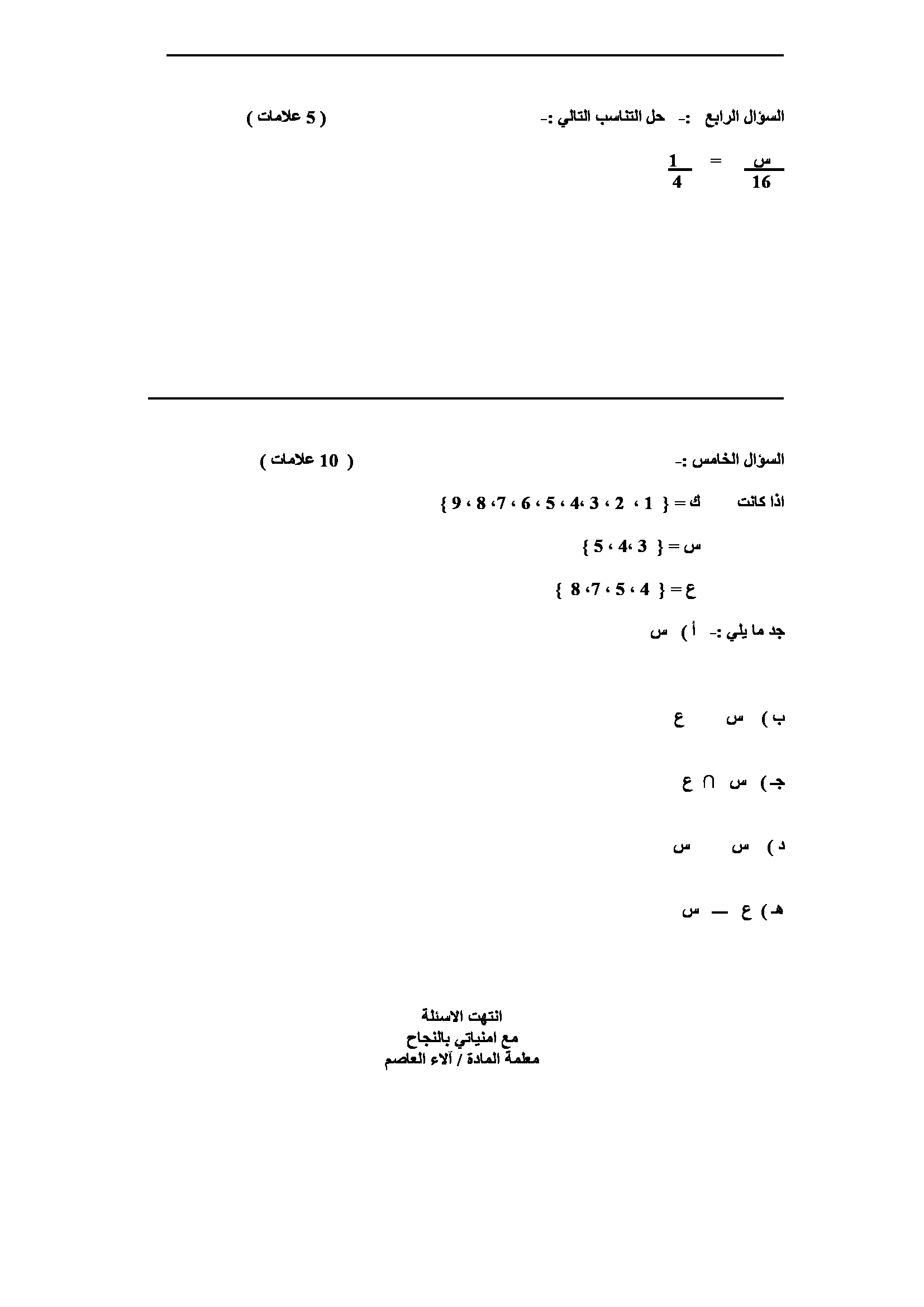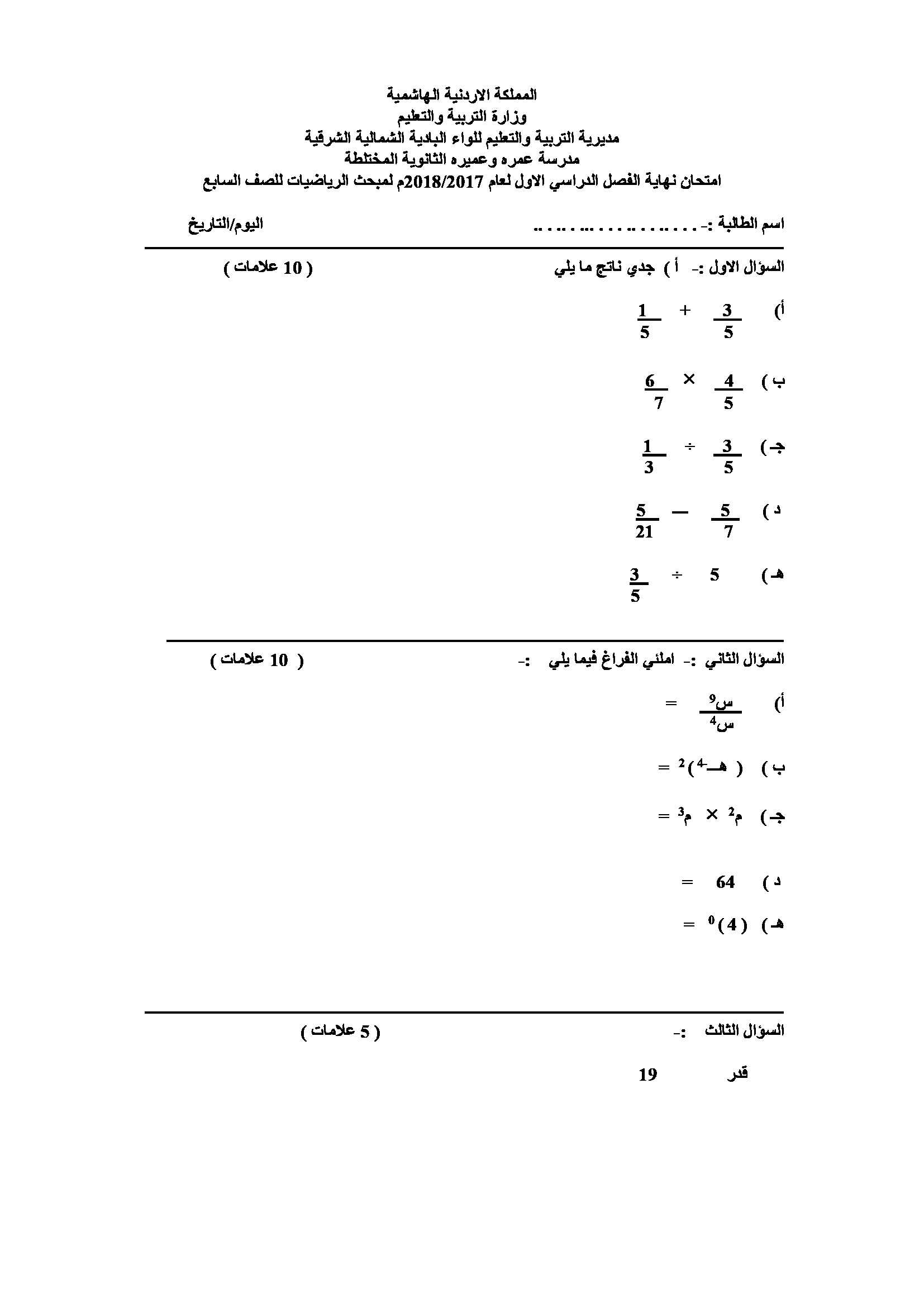 امتحان مادة الرياضيات للصف السابع نهاية الفصل الاول 2018 اختبار مادة الرياضيات للصف السابع نهاية الفصل الاول 2018 اختبار مادة الرياضيات للصف السابع ن