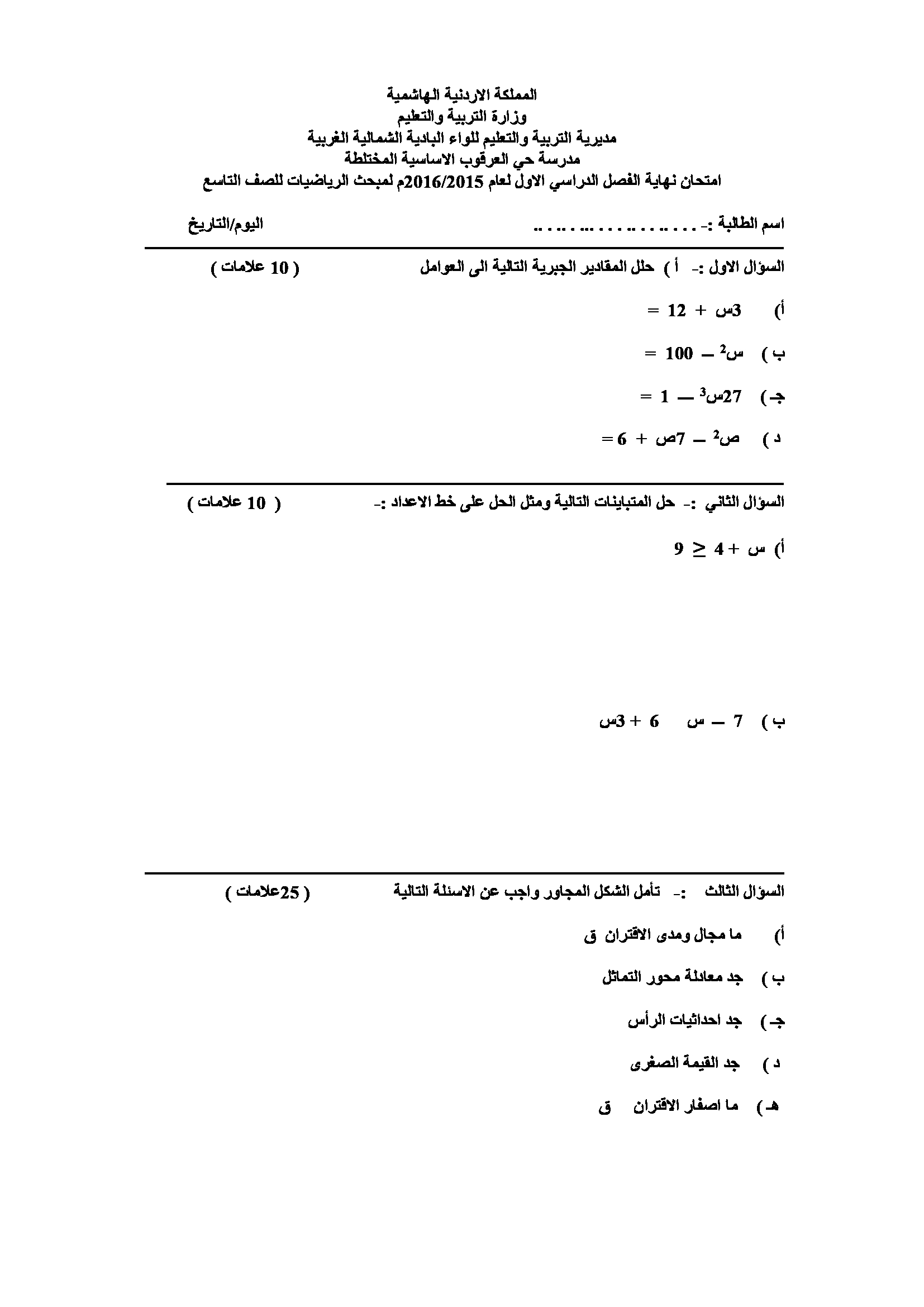 امتحان مادة الرياضيات للصف التاسع نهاية الفصل الاول 2018 اختبار مادة الرياضيات للصف التاسع نهاية الفصل الاول 2018 اختبار مادة الرياضيات للصف التاسع نه