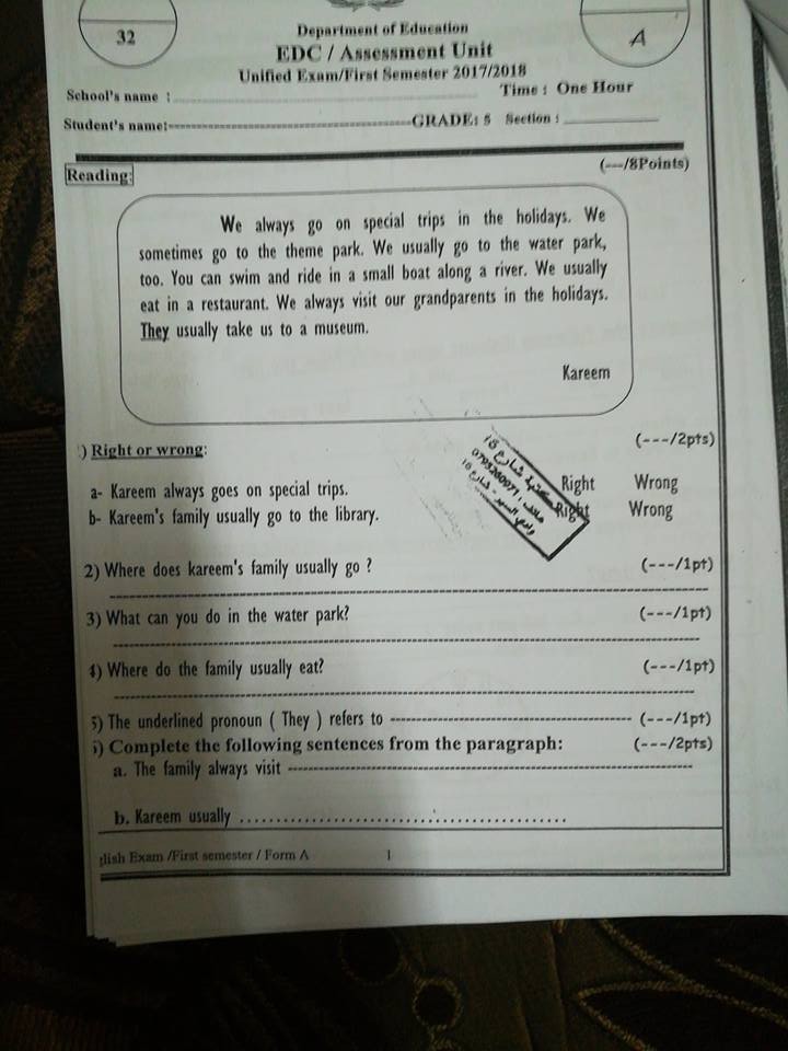 بالصور نموذج وكالة اختبار لغة انجليزية نهائي للصف الخامس الفصل الاول 2017 بالصور نموذج وكالة اختبار لغة انجليزية نهائي للصف الخامس الفصل الاول 2017