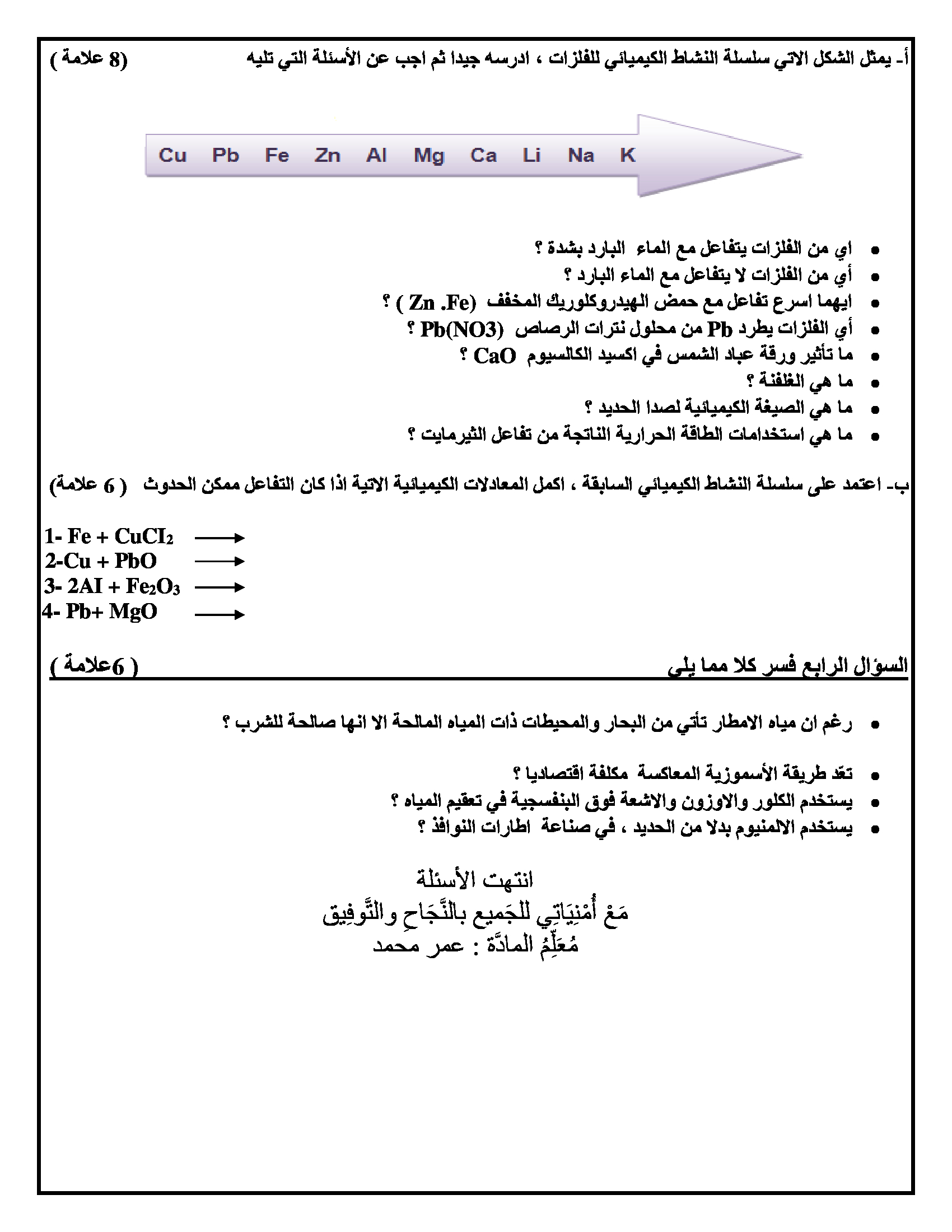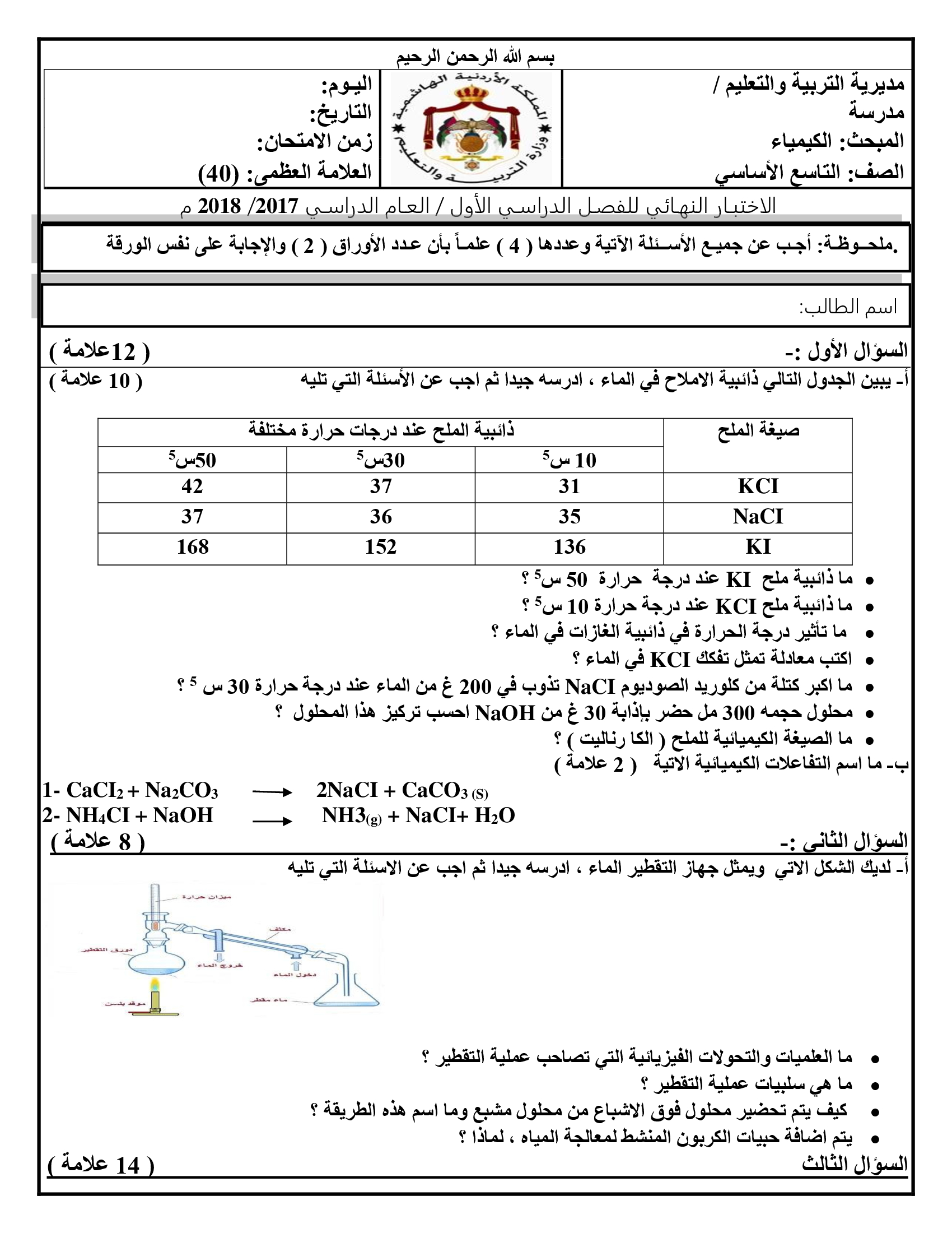 امتحان نهائي لمادة الكيمياء للصف التاسع الفصل الاول 2017 اختبار نهائي لمادة الكيمياء للصف التاسع الفصل الاول 2017 اختبار نهائي لمادة الكيمياء للصف الت