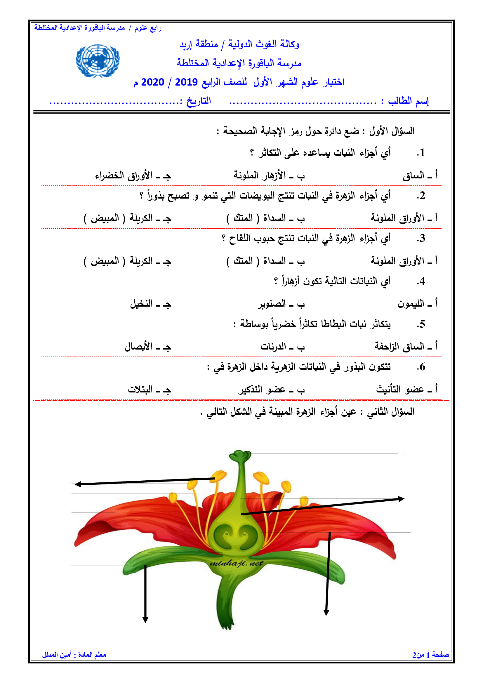 اختبار الشهر الاول لمادة العلوم للصف الرابع الفصل الاول 2019