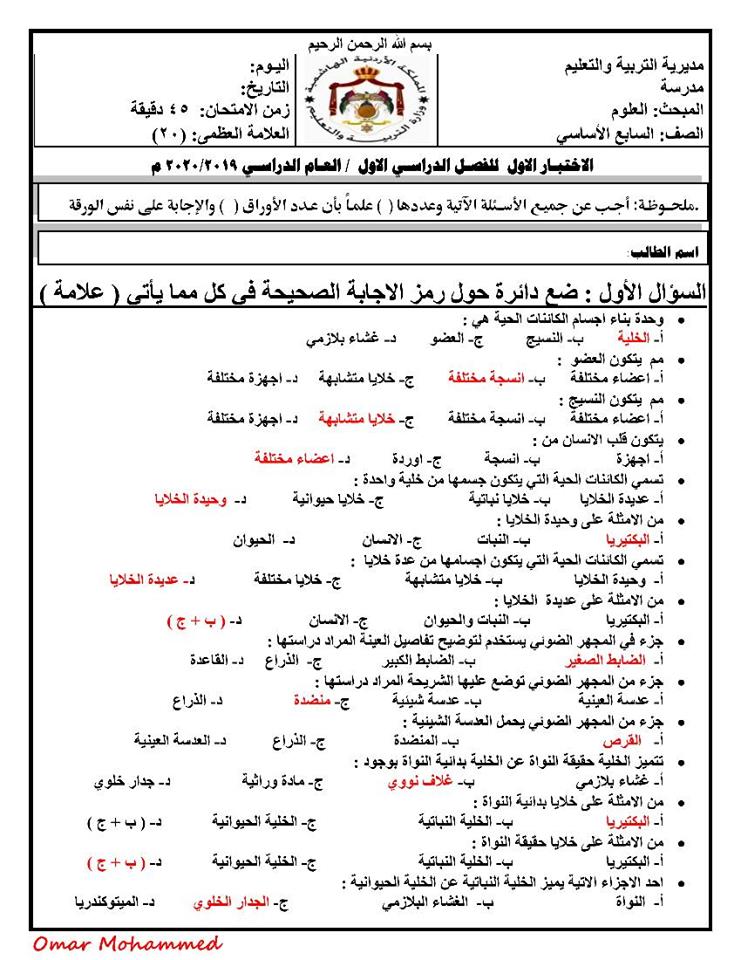 بالصور امتحان الشهر الاول لمادة العلوم للصف السابع الفصل الاول 2019 مع الاجابات