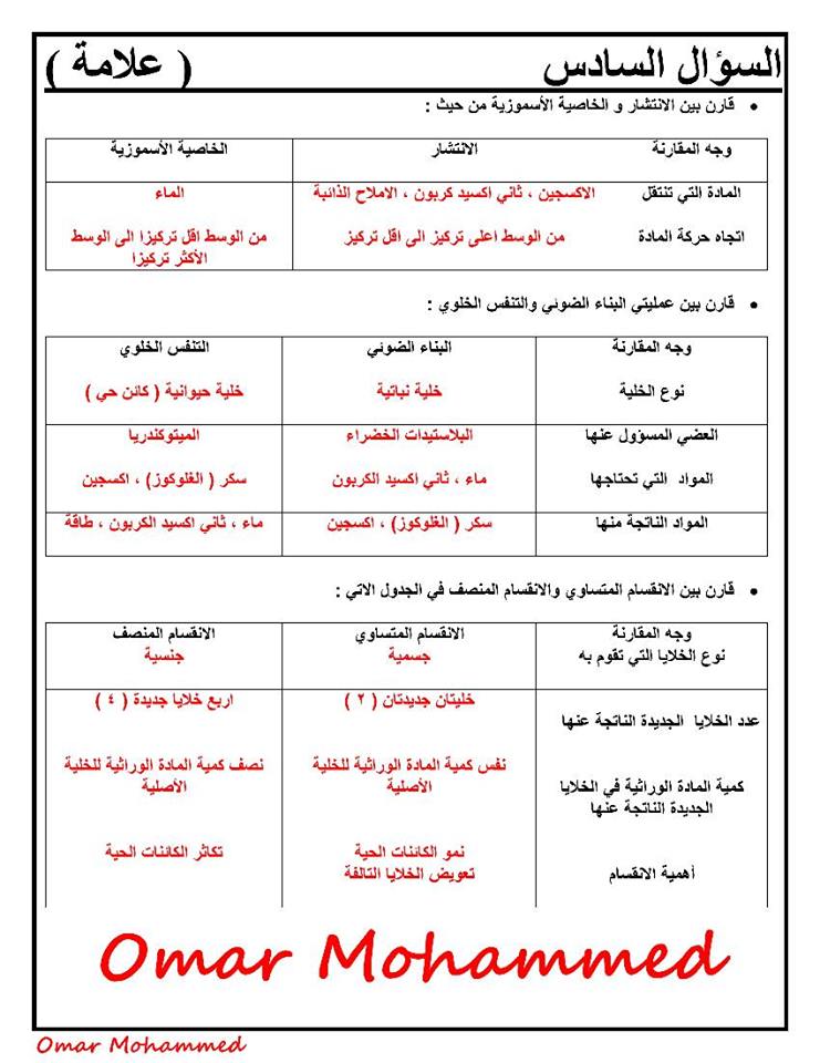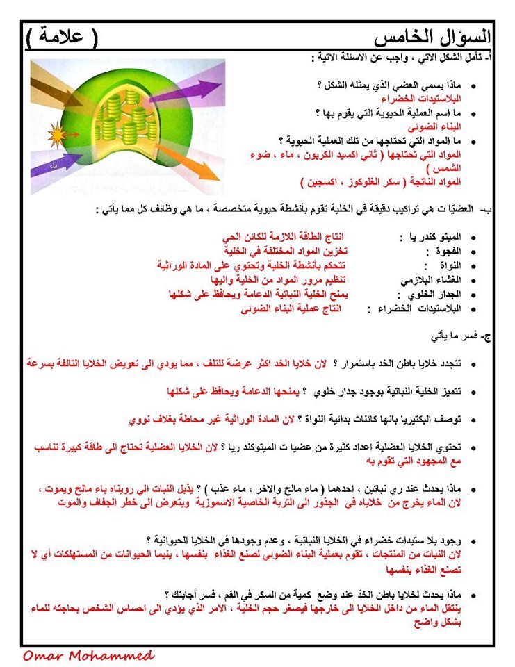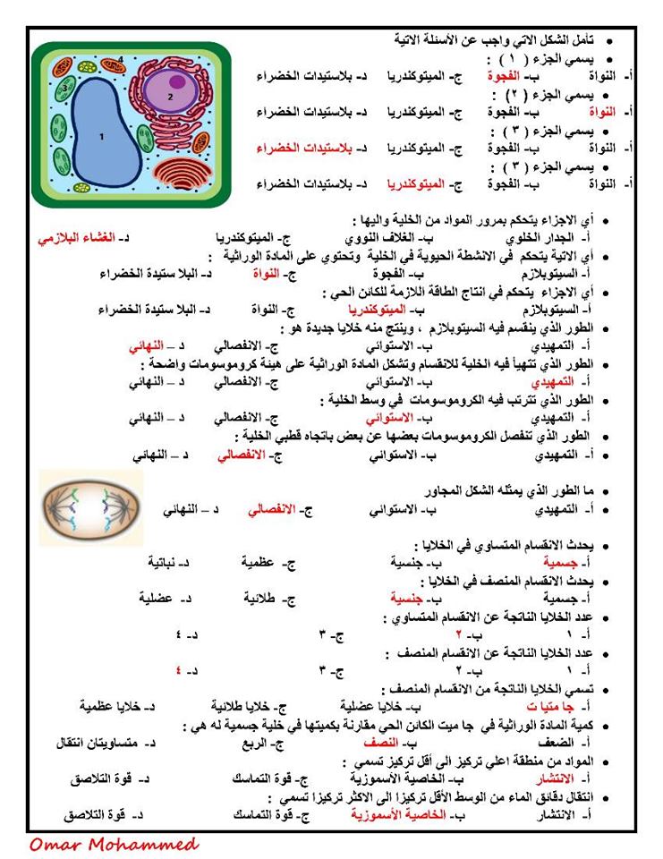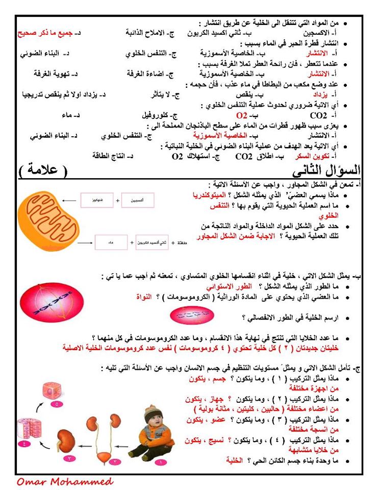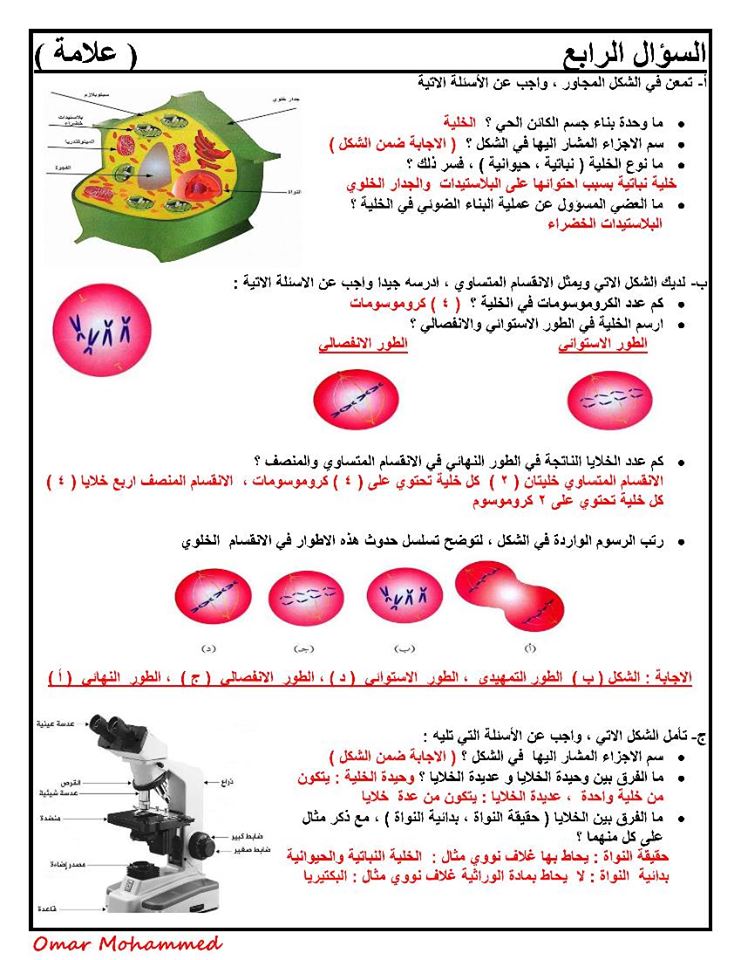 نموذج مكثف امتحان لمادة العلوم وحدة الخلية مع الإجابة النموذجية شامل