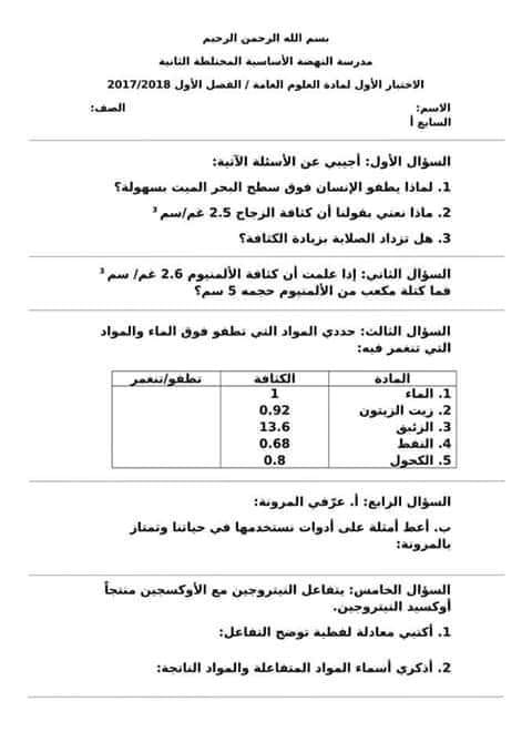 صورة اختبار العلوم الشهر الاول للصف السابع الفصل الاول 2017 صورة امتحان العلوم الشهر الاول للصف السابع الفصل الاول 2017