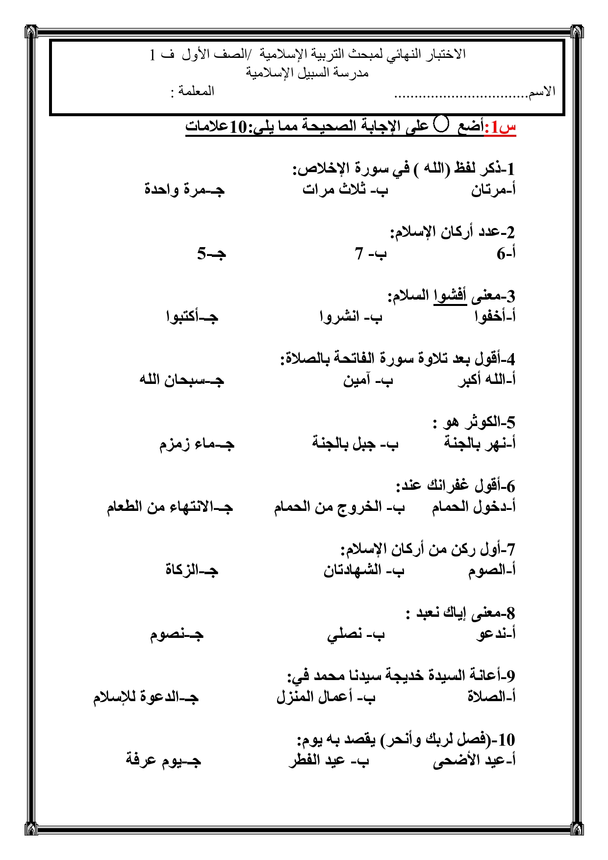 اختبار نهائي لمادة التربية الاسلامية للصف الاول الفصل الاول 2018 امتحان نهائي لمادة التربية الاسلامية للصف الاول الفصل الاول 2018 امتحان نهائي لمادة ا