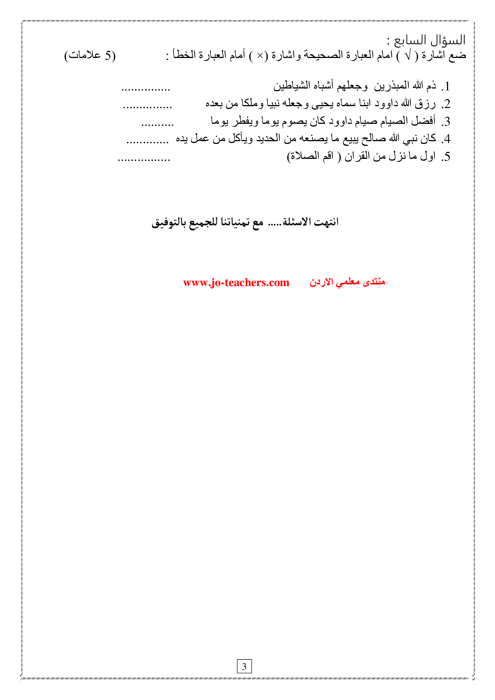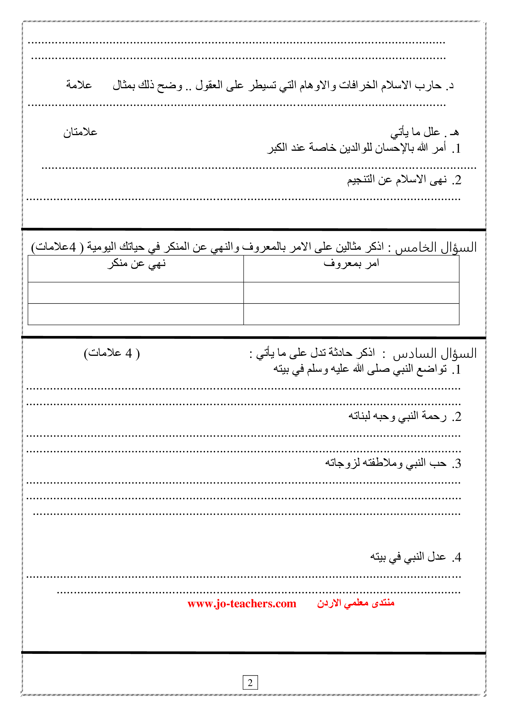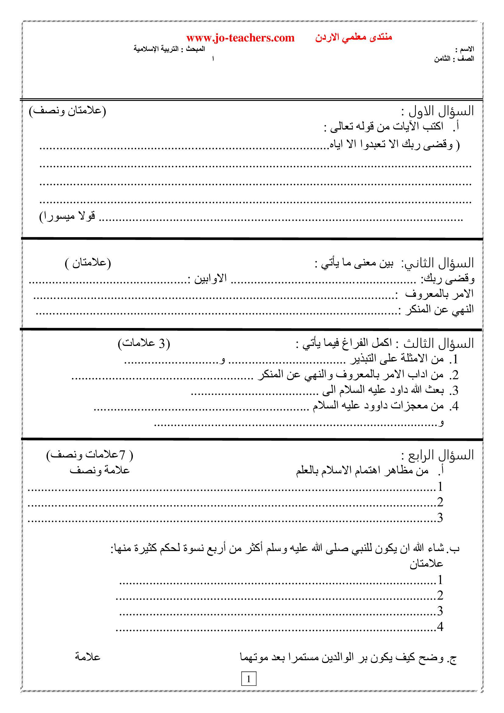 امتحان الشهر الثاني لمادة التربية الاسلامية للصف الثامن الفصل الاول 2019 اختبار الشهر الثاني لمادة التربية الاسلامية للصف الثامن الفصل الاول 2019 اختب