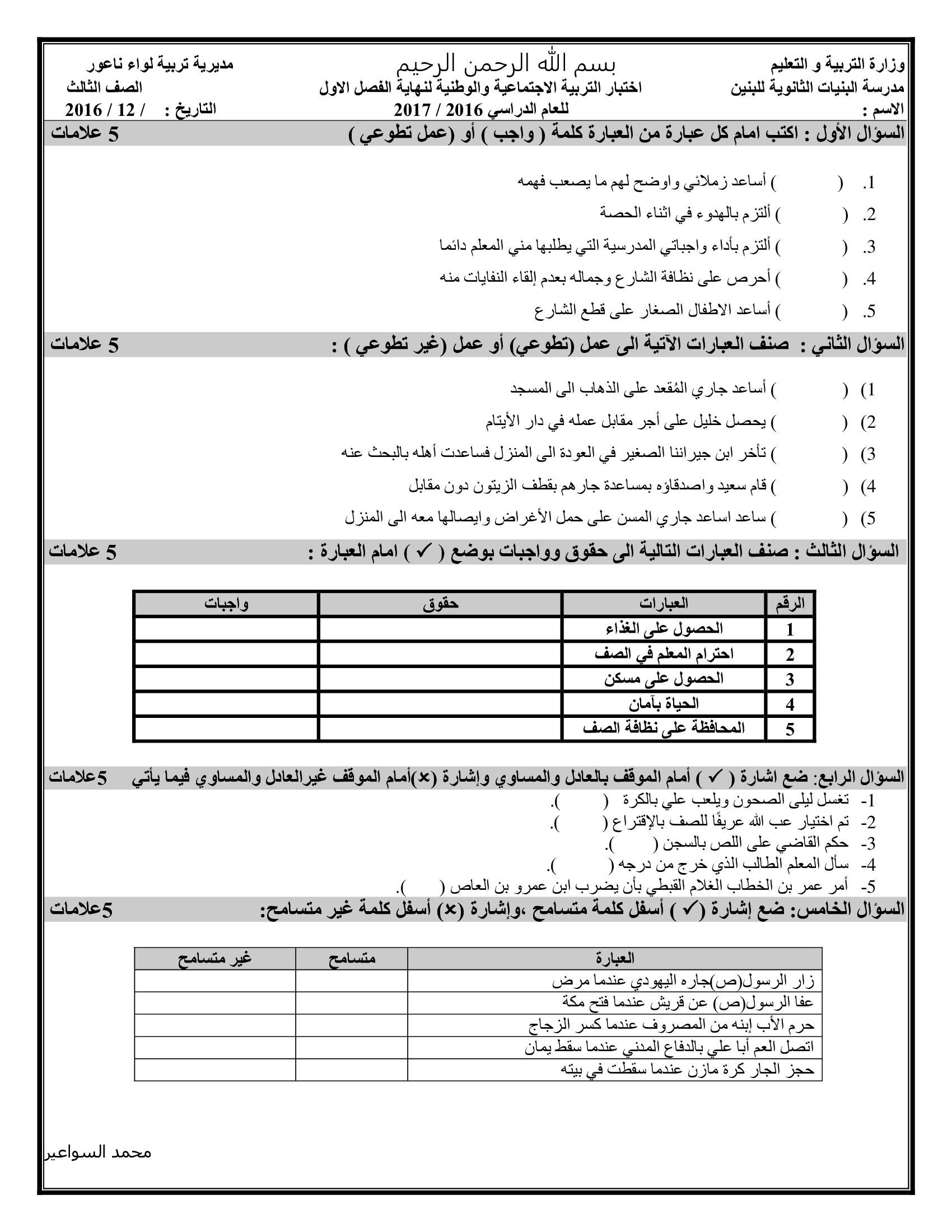 الاختبار النهائي لمادة الاجتماعيات للصف الثالث الفصل الاول 2017 الامتحان النهائي لمادة الاجتماعيات للصف الثالث الفصل الاول 2017 الامتحان النهائي لمادة