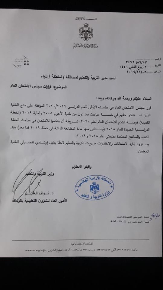 السماح لطلبة الثانوية العامة الذين استنفذو حقهم بالتقدم للامتحان بخمس مباحث فما دون طلبة عام 2005ولغاية 2019 السماح لطلبة الثانوية العامة بالتقدم للام