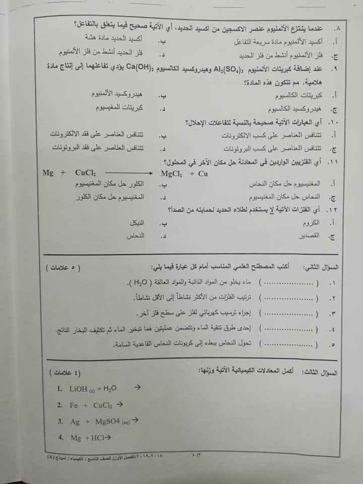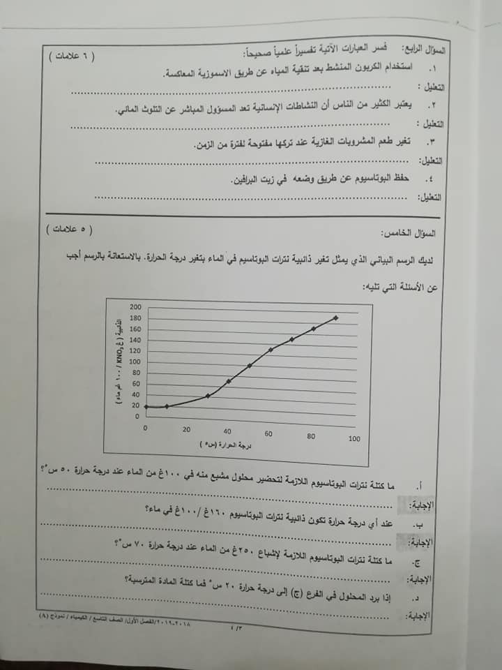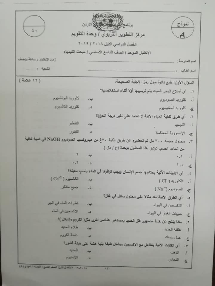 بالصور نموذج A وكالة اختبار الكيمياء النهائي للصف التاسع الفصل الاول 2018 بالصور نموذج A وكالة امتحان الكيمياء النهائي للصف التاسع الفصل الاول 2018 با
