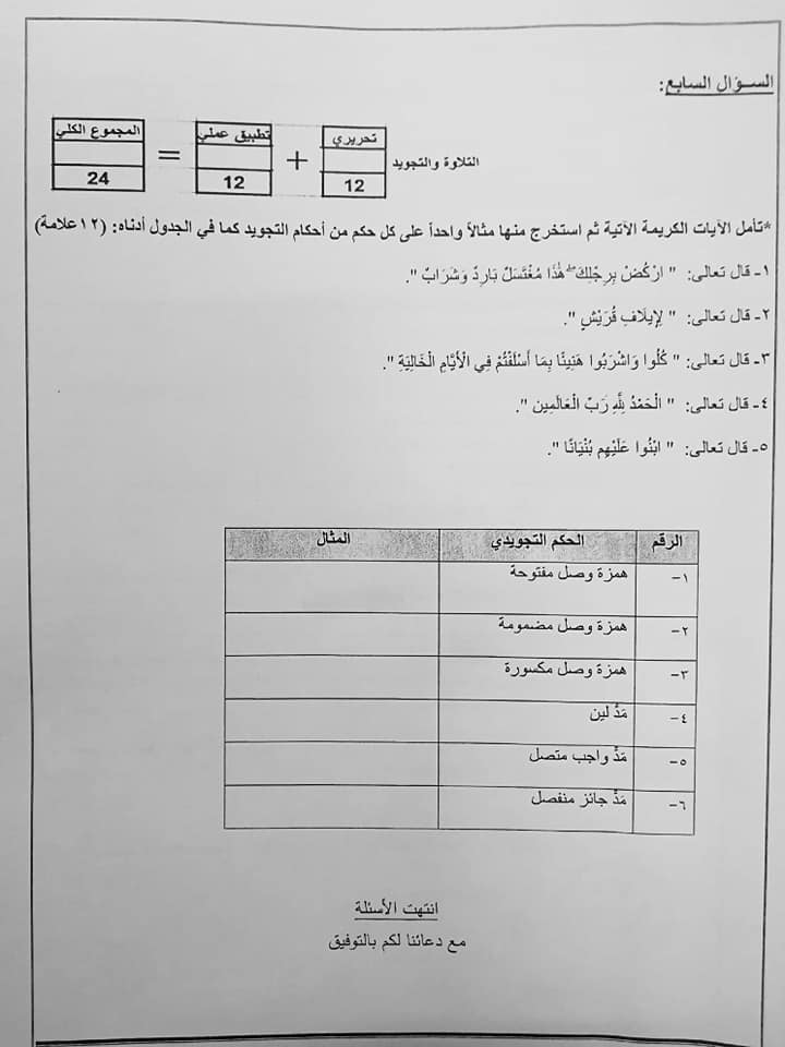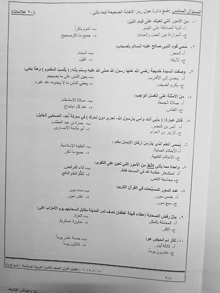 بالصور نموذج A وكالة امتحان التربية الاسلامية النهائي للصف الثامن الفصل الاول 2018