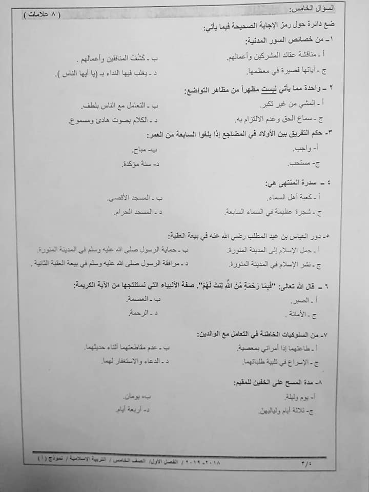 بالصور نموذج A وكالة امتحان التربية الاسلامية النهائي للصف الخامس الفصل الاول 2018