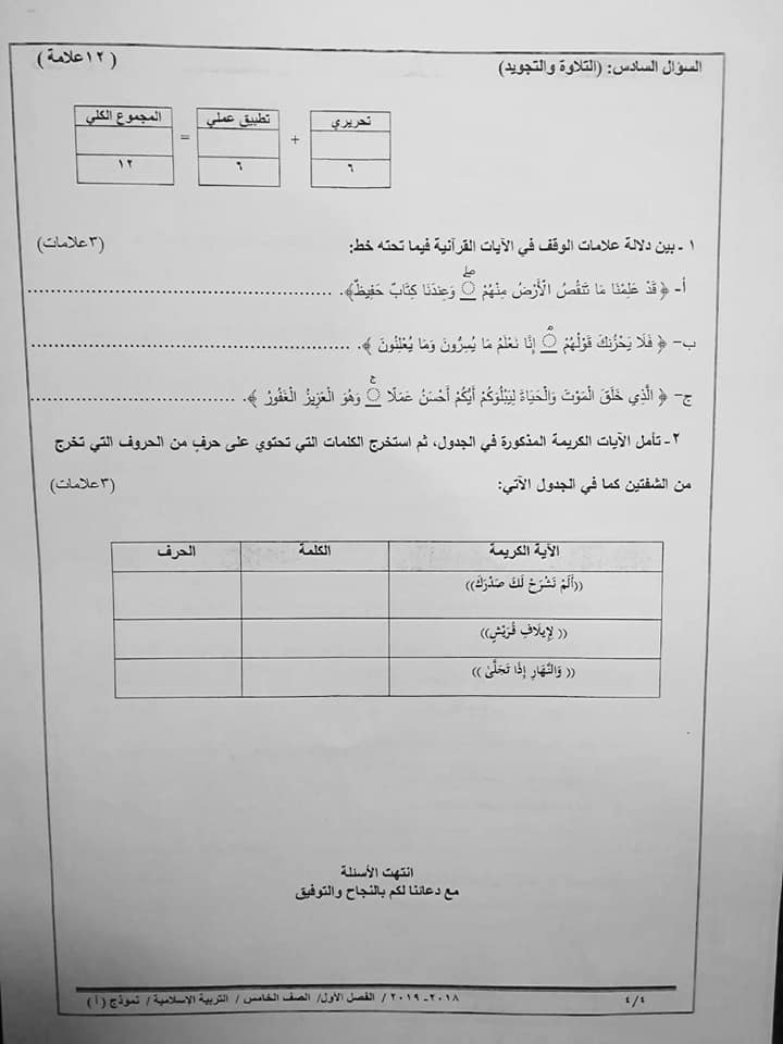 بالصور نموذج A وكالة اختبار التربية الاسلامية النهائي للصف الخامس الفصل الاول 2018 بالصور نموذج A وكالة امتحان التربية الاسلامية النهائي للصف الخامس الفصل الاول 2018