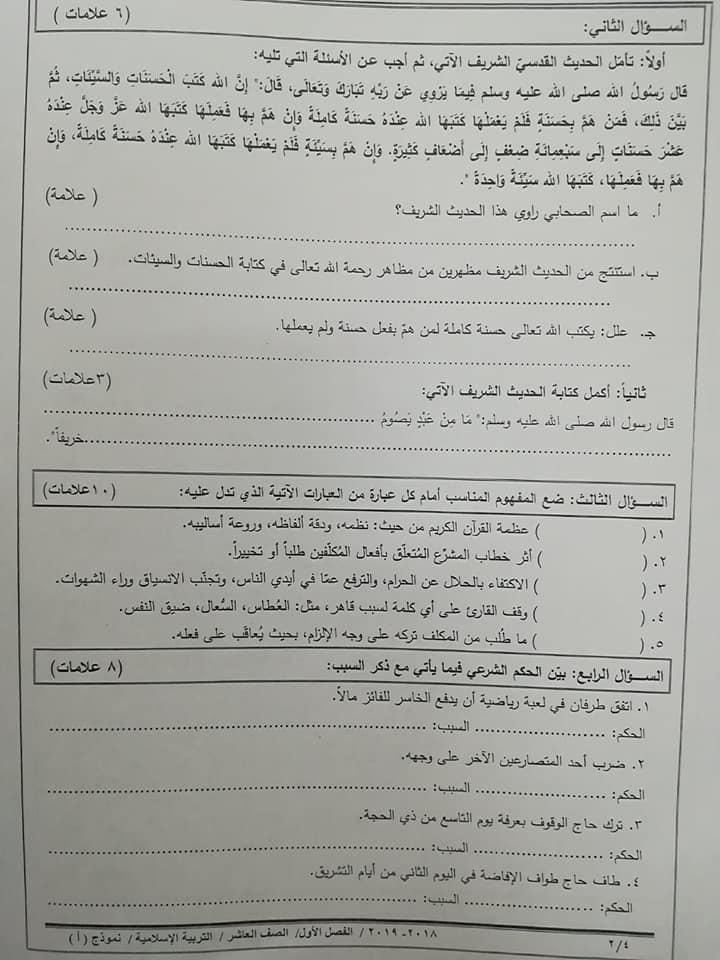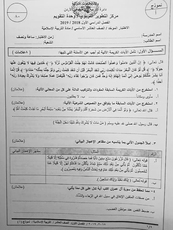بالصور نموذج A وكالة امتحان التربية الاسلامية النهائي للصف العاشر الفصل الاول 2018