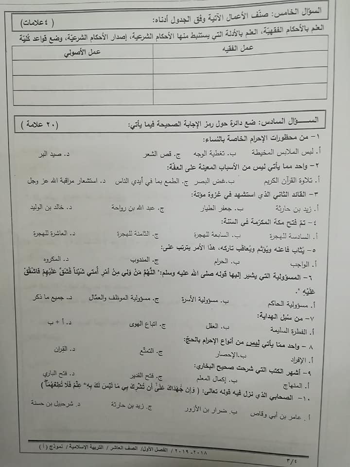 بالصور نموذج A وكالة اختبار التربية الاسلامية النهائي للصف العاشر الفصل الاول 2018 بالصور نموذج A وكالة امتحان التربية الاسلامية النهائي للصف العاشر الفصل الاول 2018