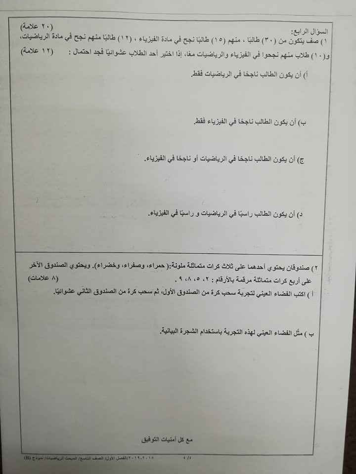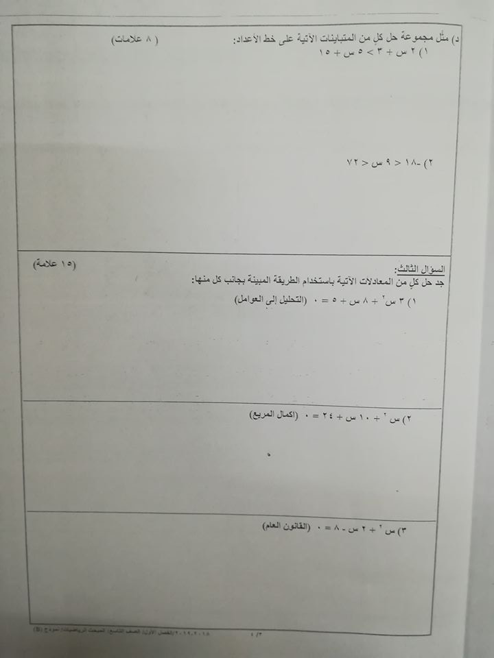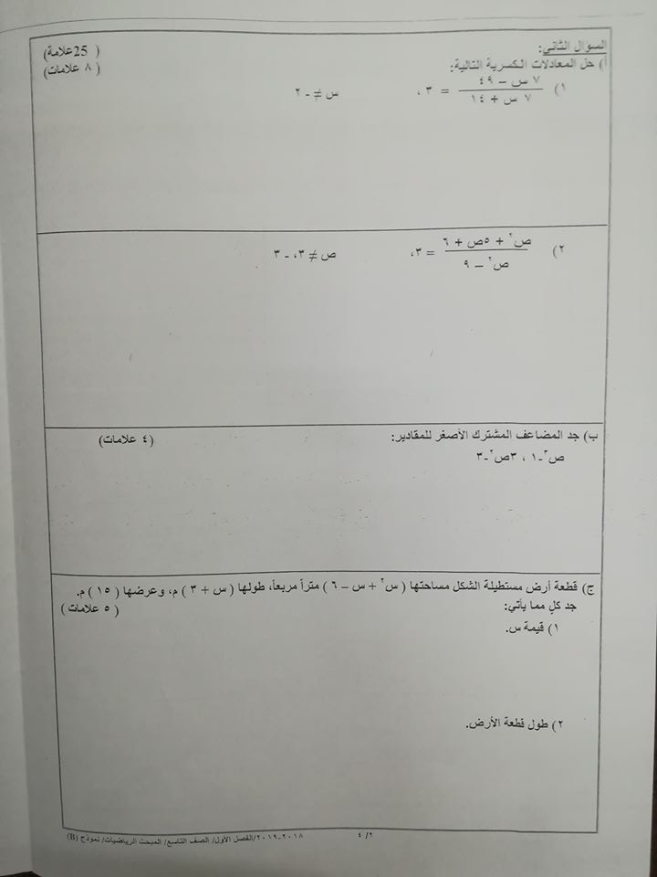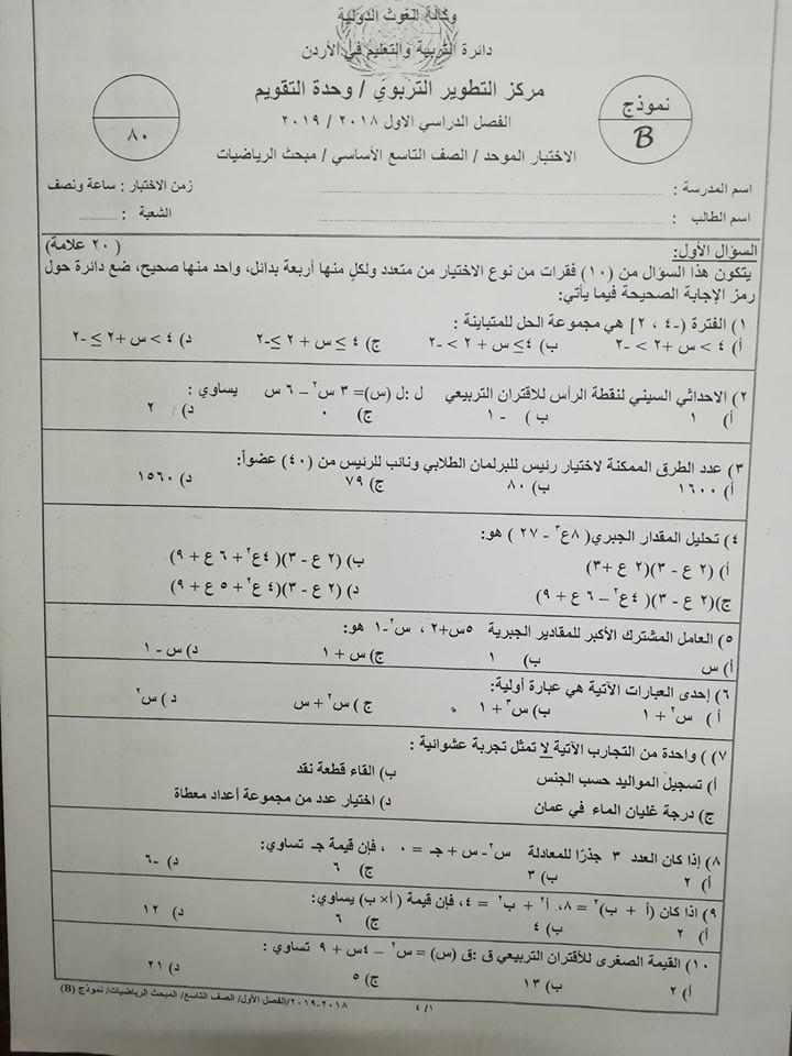 بالصور نموذج B وكالة امتحان الرياضيات النهائي للصف التاسع الفصل الاول 2018 بالصور نموذج B وكالة اختبار الرياضيات النهائي للصف التاسع الفصل الاول 2018