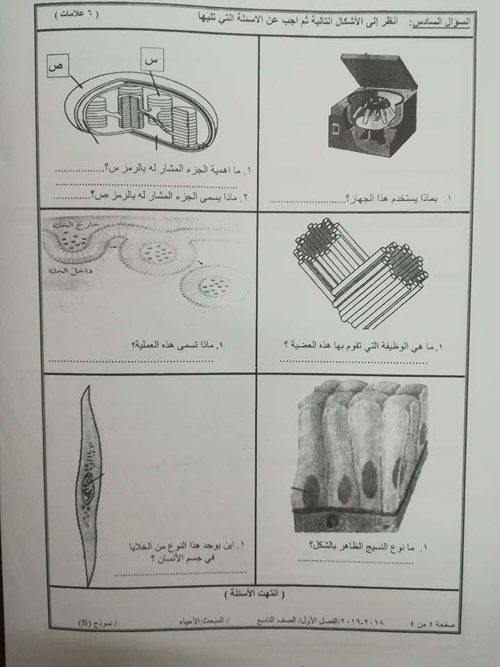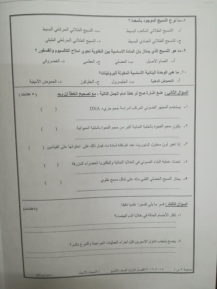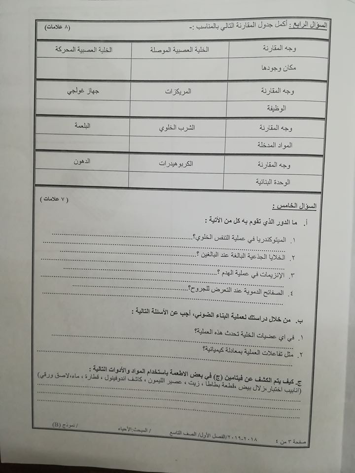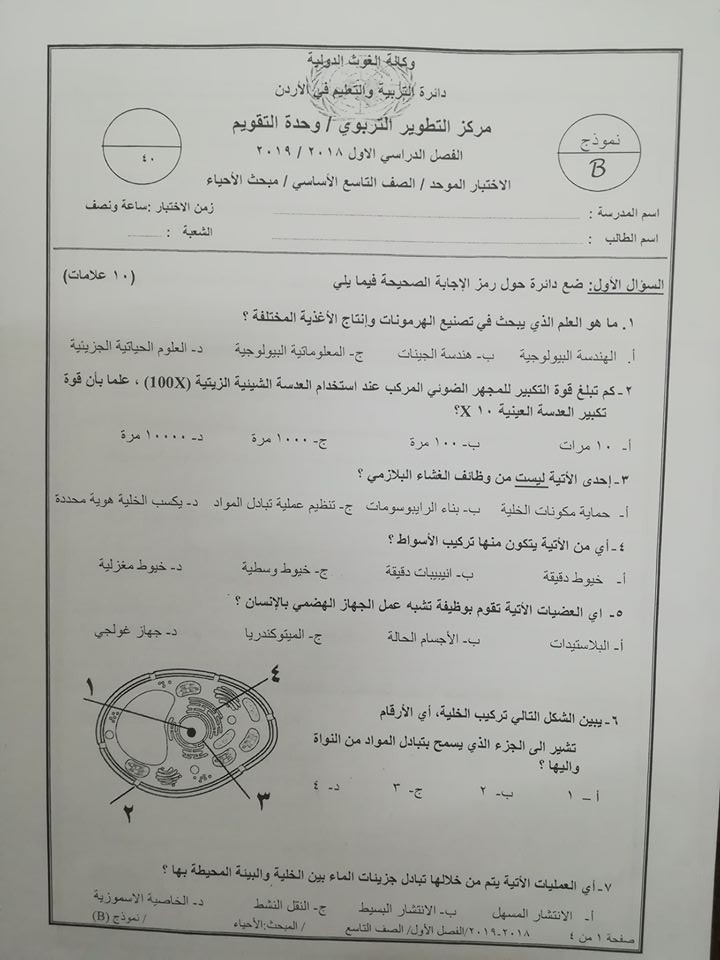بالصور نموذج B وكالة امتحان الاحياء النهائي للصف التاسع الفصل الاول 2018 بالصور نموذج B وكالة اختبار الاحياء النهائي للصف التاسع الفصل الاول 2018 بالص