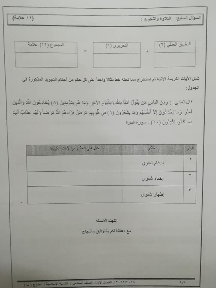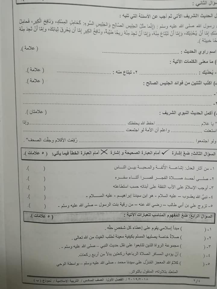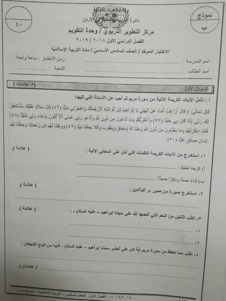 بالصور نموذج B وكالة امتحان التربية الاسلامية النهائي للصف السادس الفصل الاول 2018 بالصور نموذج B وكالة اختبار التربية الاسلامية النهائي للصف السادس الفصل الاول 2018