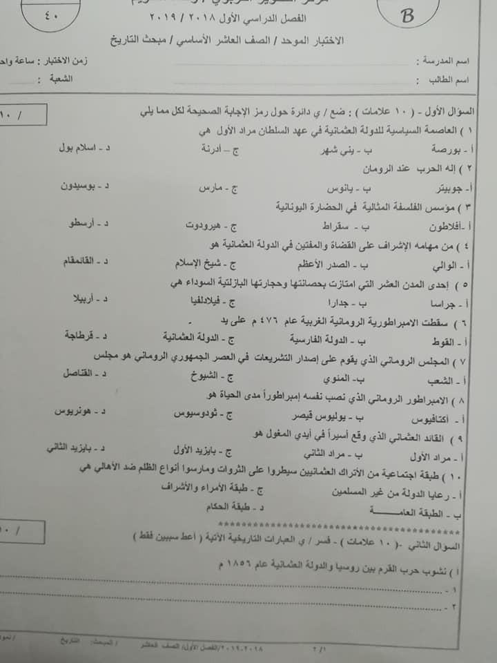 نموذج B وكالة امتحان التاريخ النهائي للصف العاشر الفصل الاول 2018