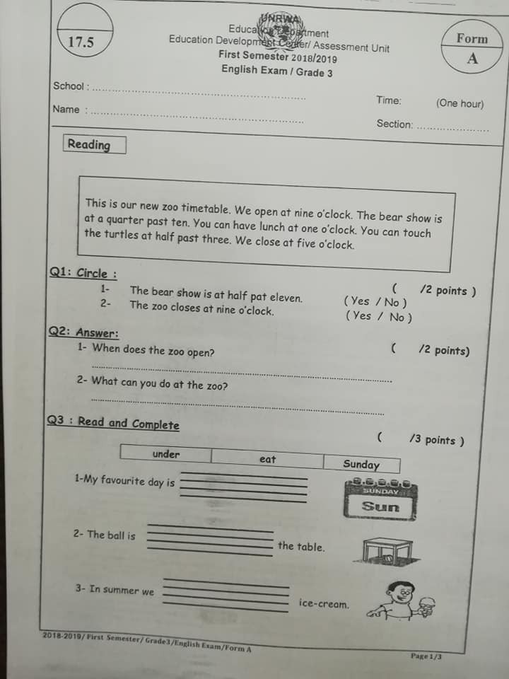 نموذج A وكالة امتحان اللغة الانجليزية النهائي للصف الثالث الفصل الاول 2018 نموذج A وكالة اختبار اللغة الانجليزية النهائي للصف الثالث الفصل الاول 2018