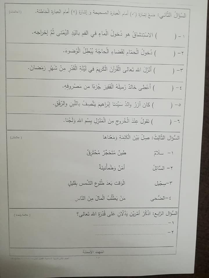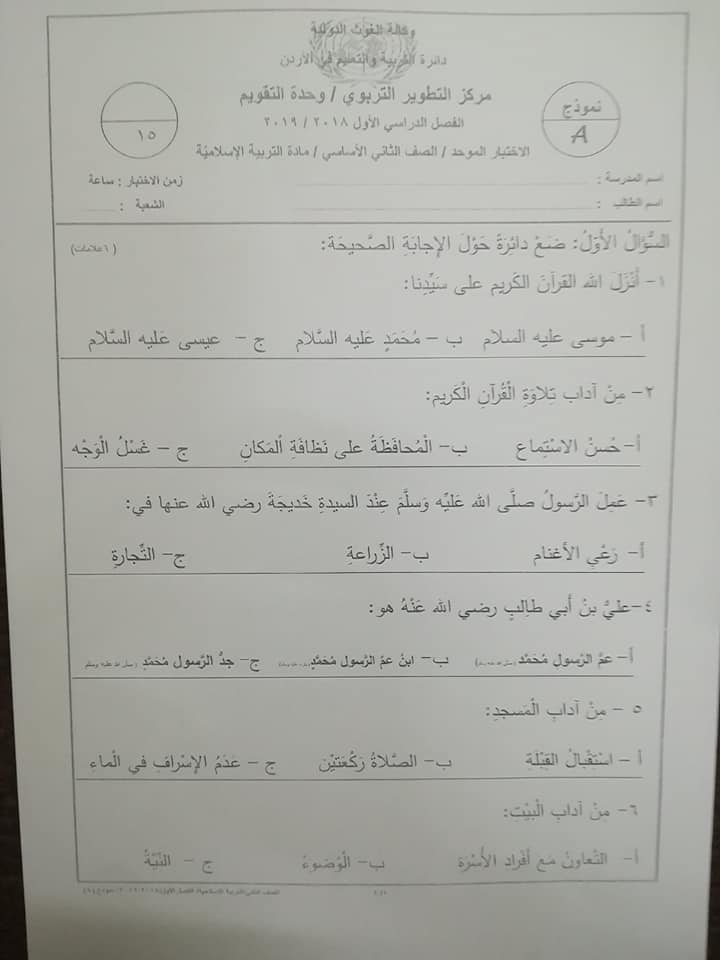 نموذج A وكالة اختبار التربية الاسلامية النهائي للصف الثاني الفصل الاول 2018 نموذج A وكالة امتحان التربية الاسلامية النهائي للصف الثاني الفصل الاول 2018