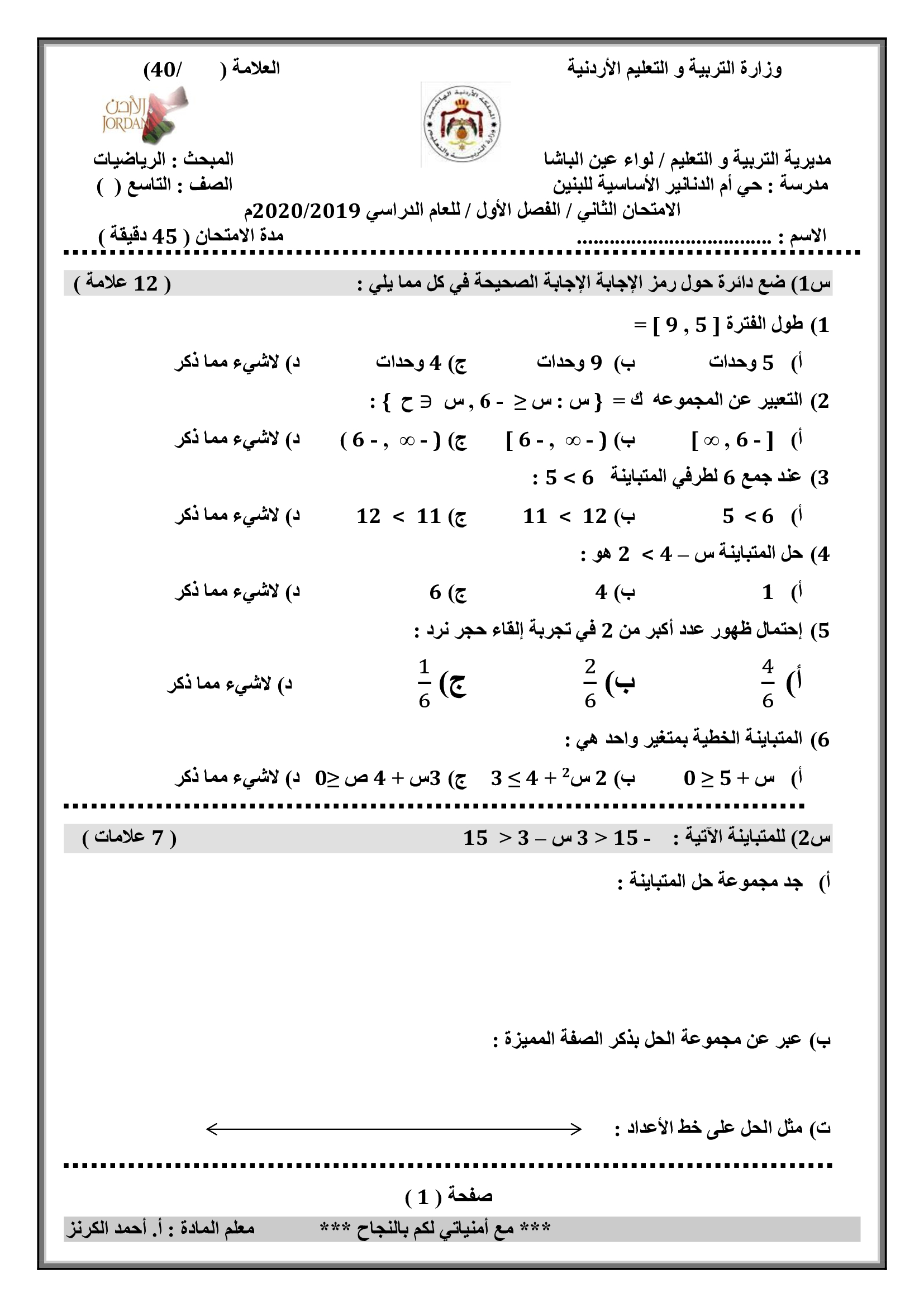 امتحان الرياضيات الشهر الثاني للصف التاسع الفصل الاول 2019-0.jpg