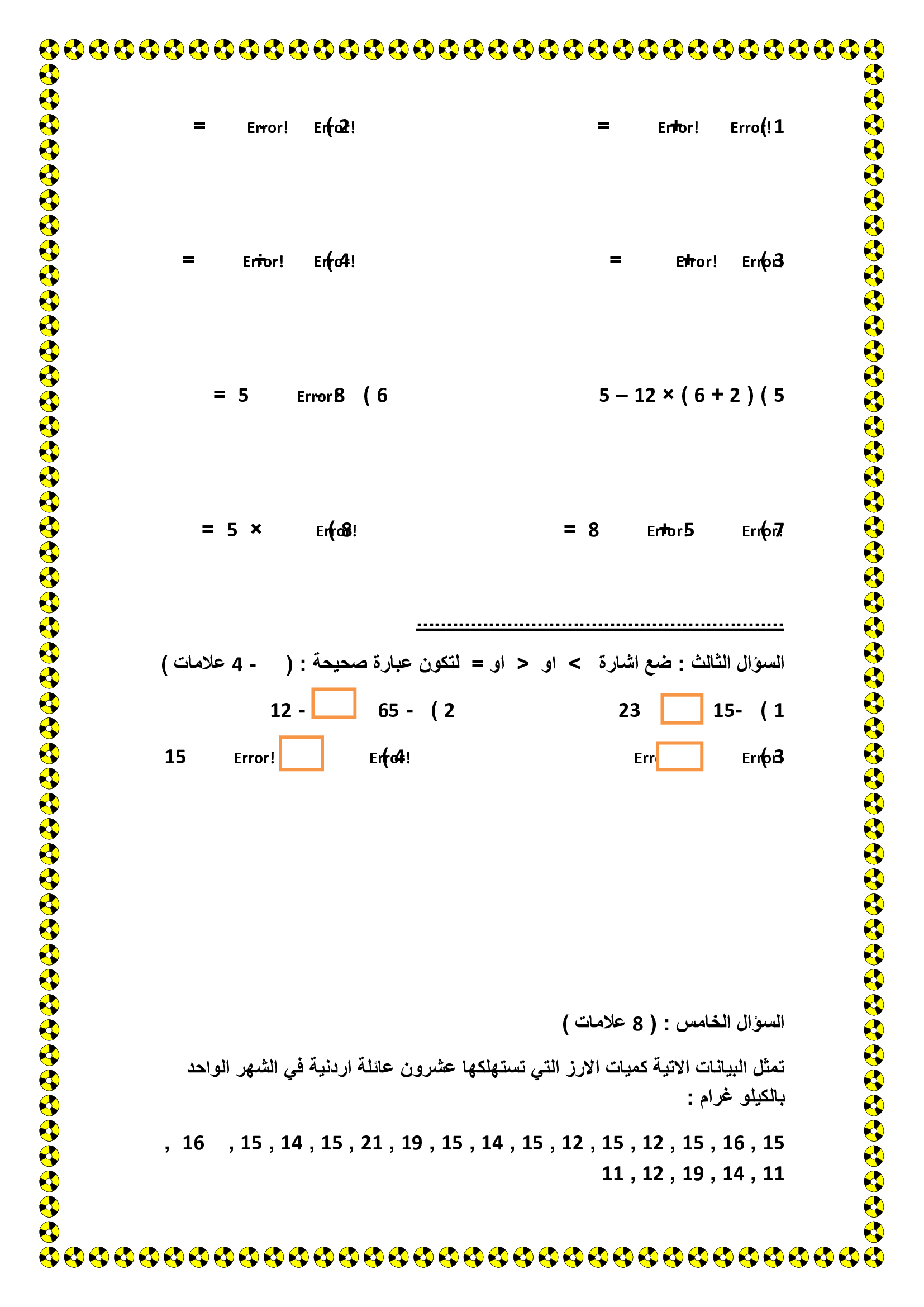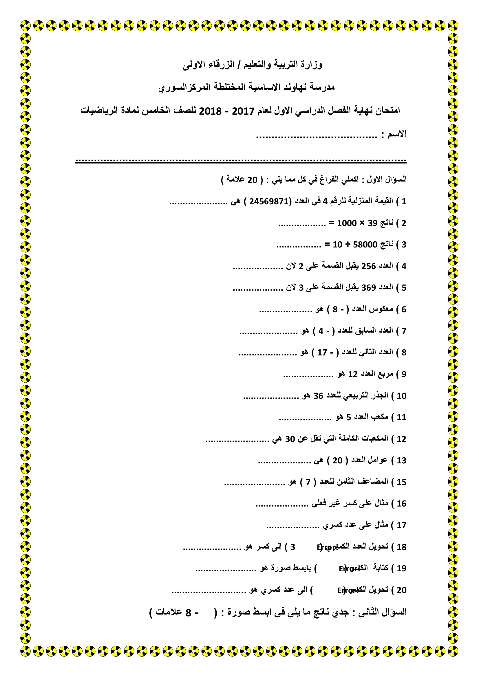 صور و وورد اختبار الرياضيات النهائي للصف الخامس الفصل الاول 2018 صور و وورد امتحان الرياضيات النهائي للصف الخامس الفصل الاول 2018 صور و وورد امتحان ال