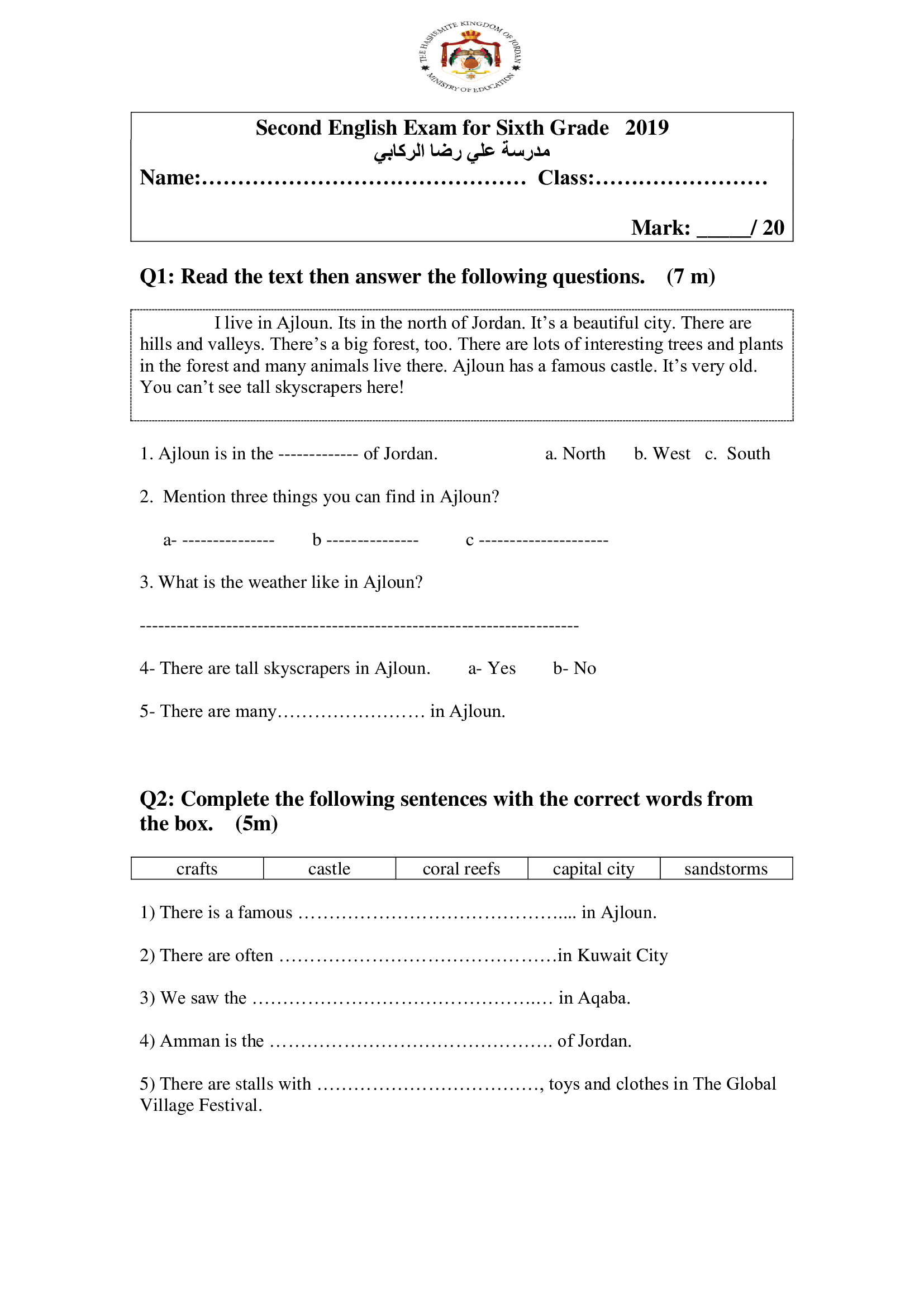 اختبار اللغة الانجليزية الشهر الثاني للصف السادس الفصل الاول 2019 امتحان اللغة الانجليزية الشهر الثاني للصف السادس الفصل الاول 2019 امتحان اللغة الانج