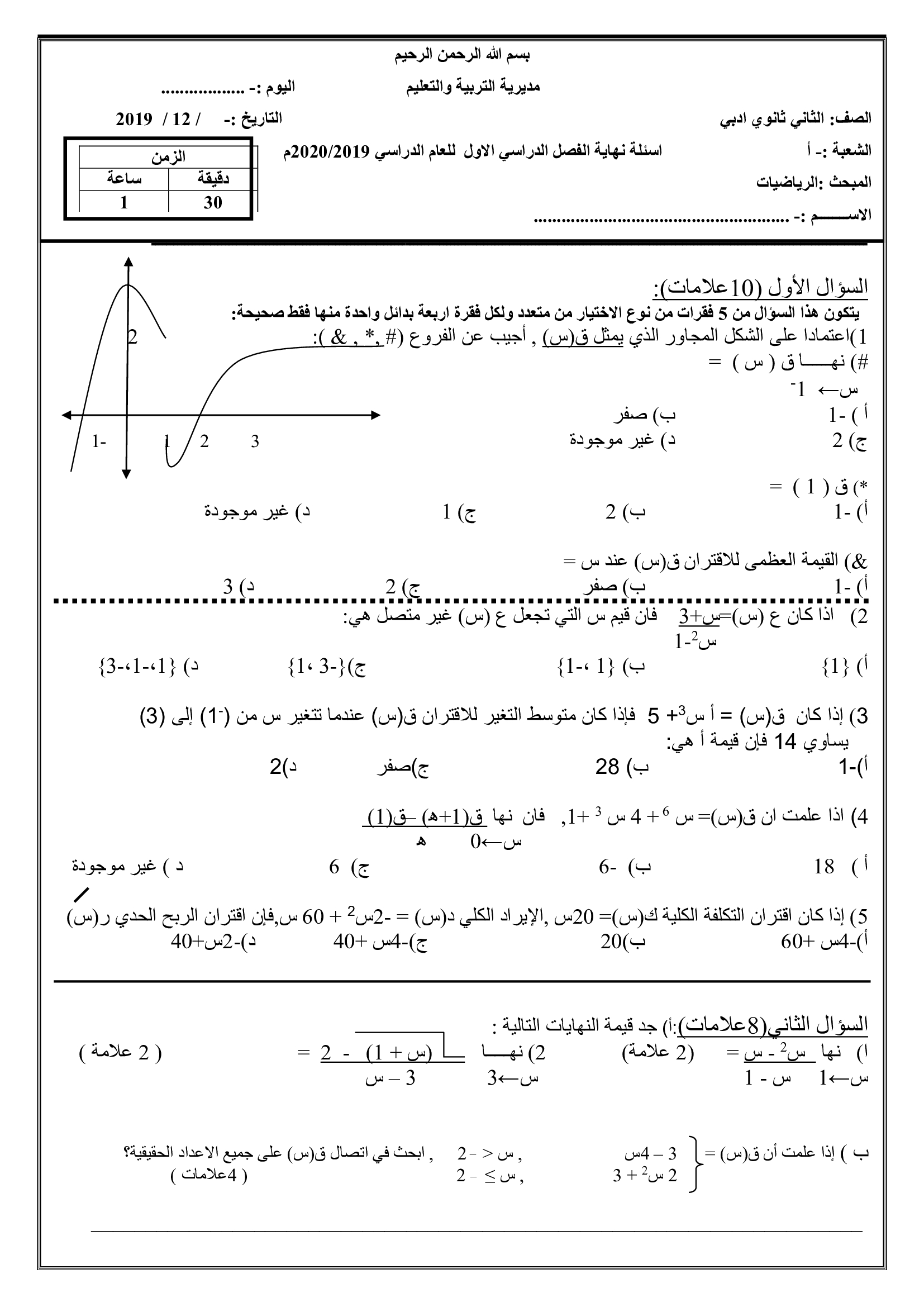 اختبار نهائي تجريبي لمادة الرياضيات للصف الثاني الثانوي الادبي الفصل الاول 2019 امتحان نهائي تجريبي لمادة الرياضيات للصف الثاني الثانوي الادبي الفصل الاول 2019
