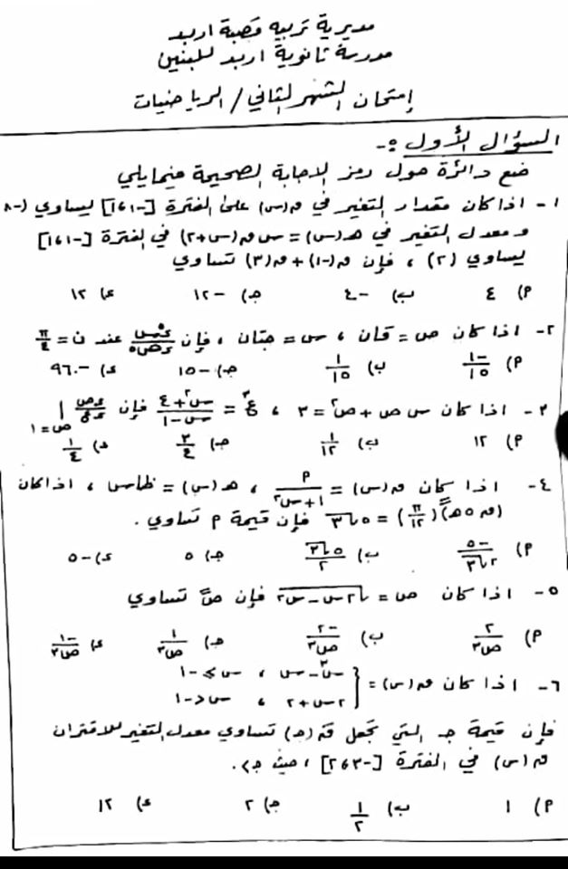 بالصور اختبار الشهر الثاني لمادة الرياضيات للثاني الثانوي العلمي الفصل الاول مع الاجابات 2019 بالصور امتحان الشهر الثاني لمادة الرياضيات للثاني الثانوي العلمي الفصل الاول مع الاجابات 2019