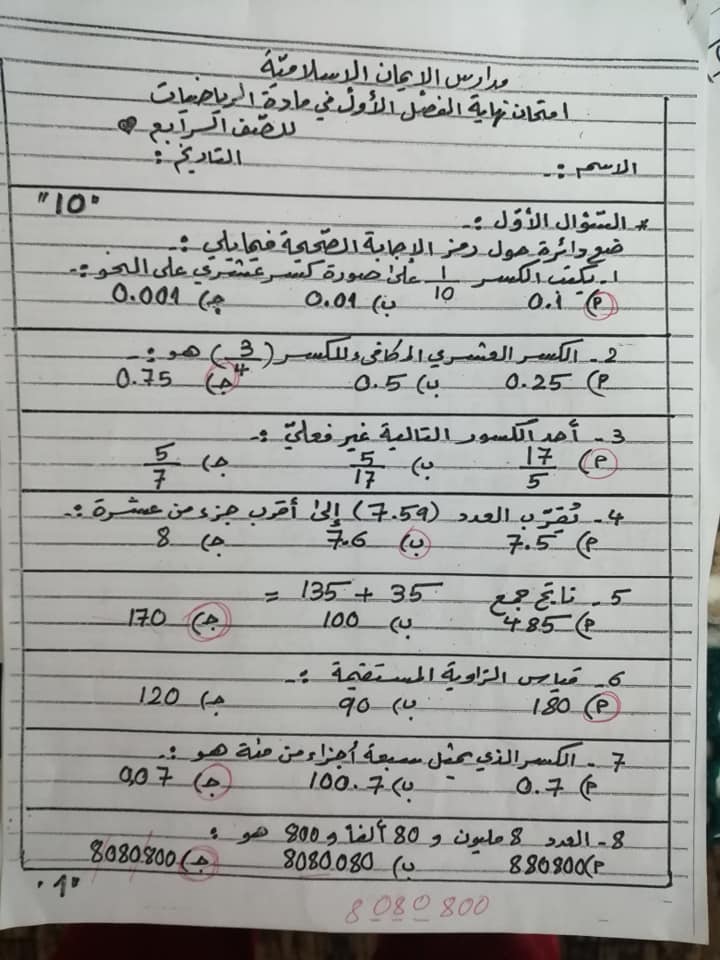 اختبار رياضيات نهائي مصور للصف الرابع الفصل الاول مع الاجابات 2019 امتحان رياضيات نهائي مصور للصف الرابع الفصل الاول مع الاجابات 2019 امتحان رياضيات ن