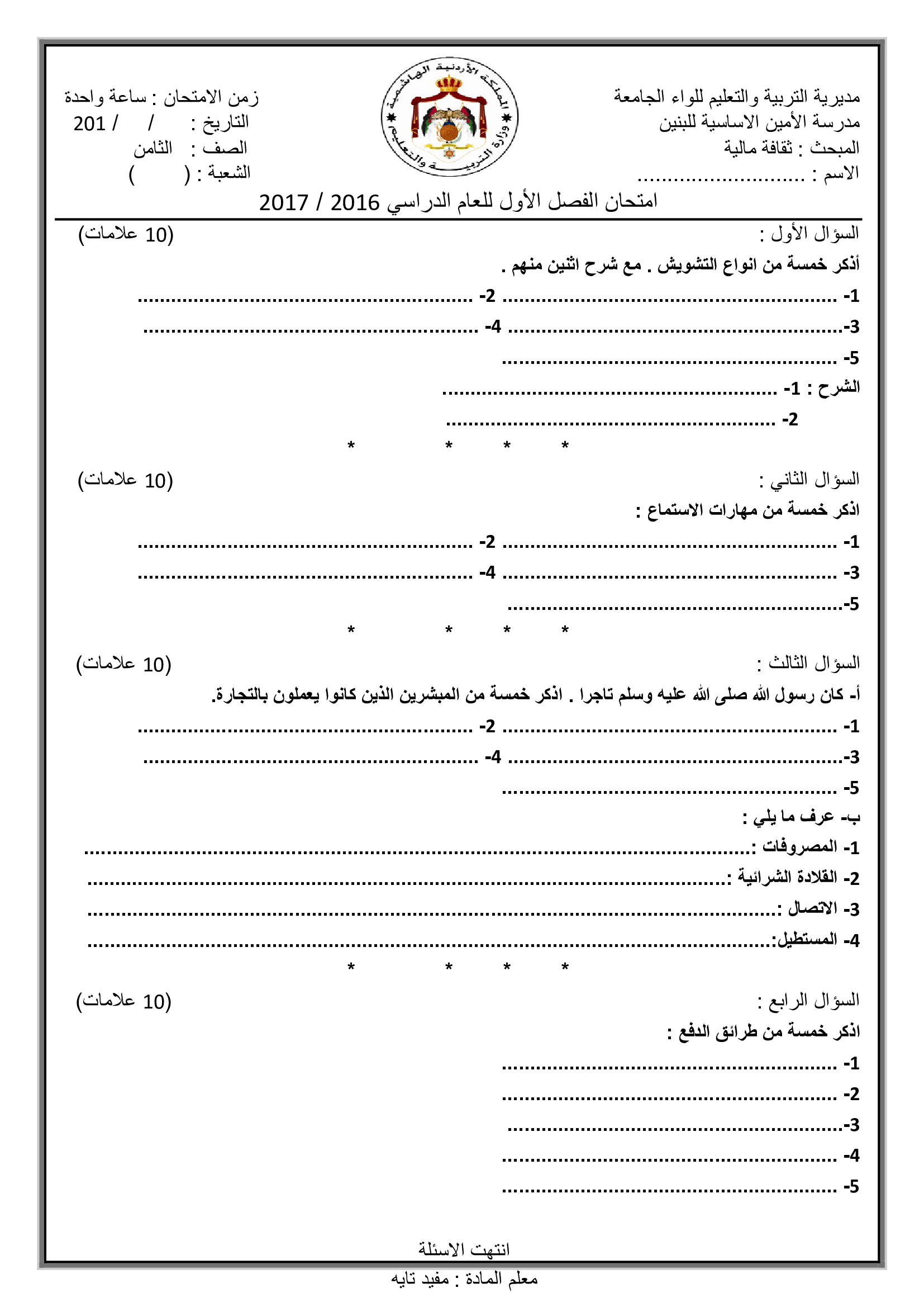 امتحان نهائي لمادة الثقافة المالية للصف الثامن الفصل الاول 2017 صور و ملف وورد امتحان نهائي لمادة الثقافة المالية للصف الثامن الفصل الاول 2017 صور ومل