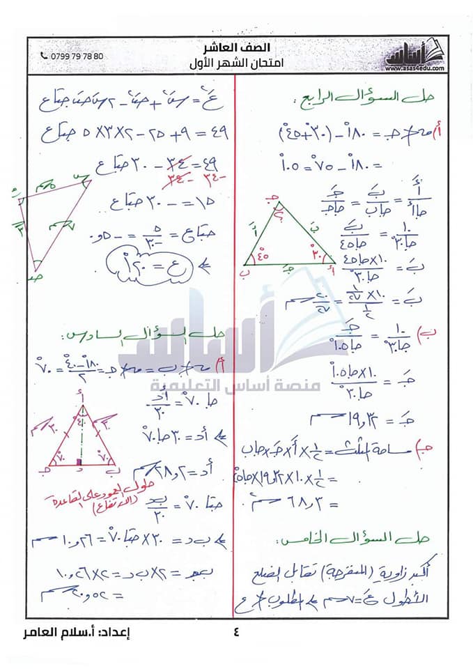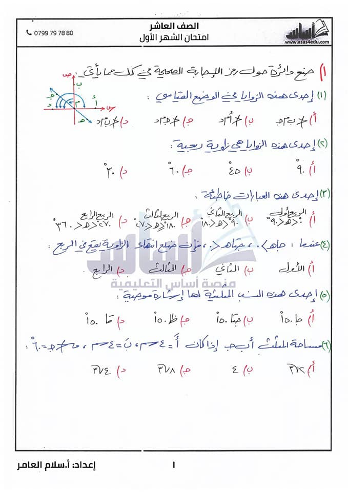 صور امتحان رياضيات شهر الاول مع الاجابات للصف العاشر الفصل الثاني 2020
