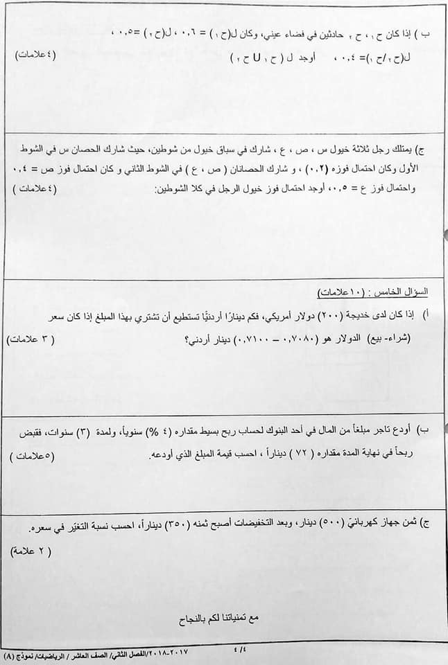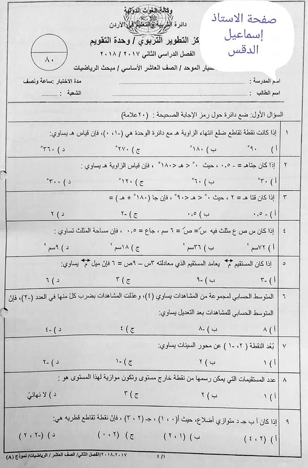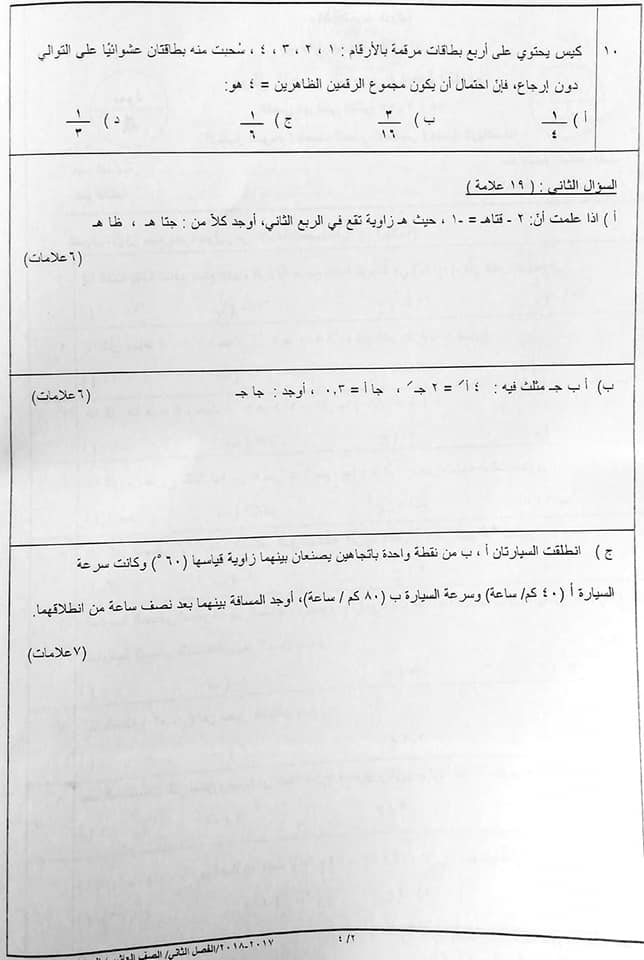 صور امتحان نهائي وكالة نموذج B مادة الرياضيات للصف العاشر الفصل الثاني 2018