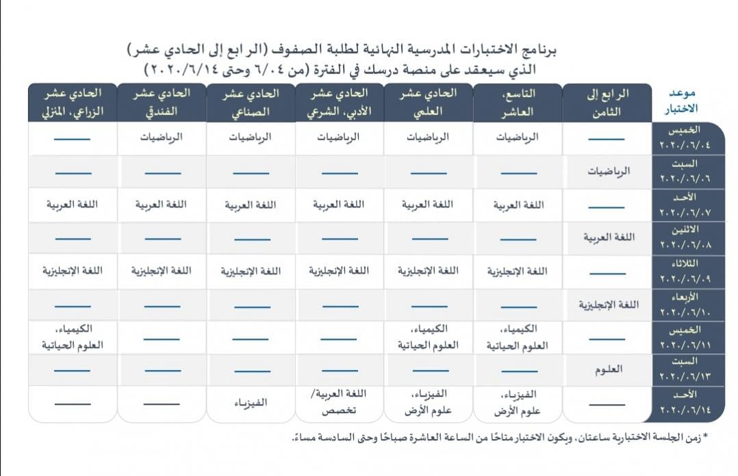 ووفق البرنامج المعلن فإن الاختبارات ستبدأ يوم الخميس الموافق 4/ 6/ 2020 وتنتهي يوم الأحد 14/ 6/ 2020م.